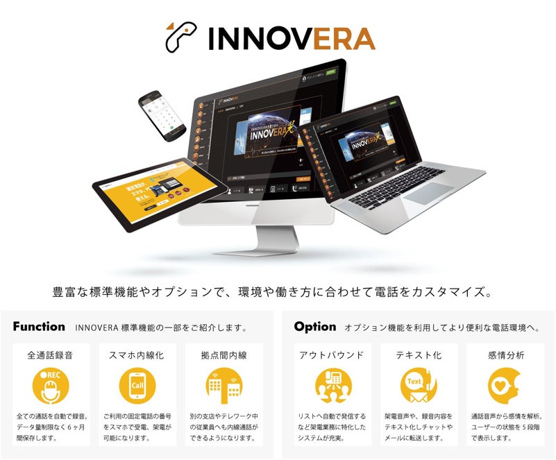 主軸サービスとなる「INNOVERA」はスマホやPCで使用している会社の電話番号の受電・架電が可能となり、会社のビジネスフォン環境をテレワーク仕様にすることができます。