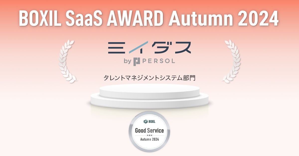「はたらいて、笑おう。」をビジョンに掲げるパーソルグループのミイダス株式会社(本社:東京都港区、代表取締役社長:後藤 喜悦)が運営する中途採用サービス『ミイダス』は、スマートキャンプ株式会社(以下「スマートキャンプ」)が主催する「BOXIL SaaS AWARD Autumn 2024」のタレントマネジメントシステム部門で「Good Service」に7期連続で選出されました。