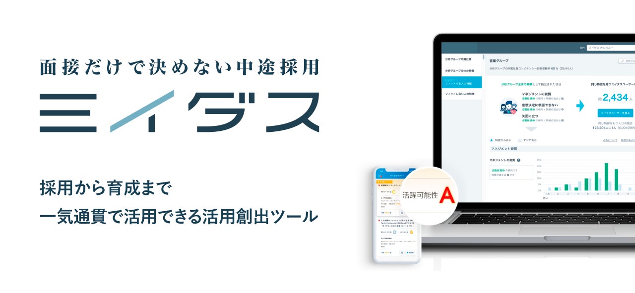 『ミイダス』は、世界初※の採用・転職におけるミスマッチを減らしながら入社後の活躍をサポートする採用・転職サービスです。