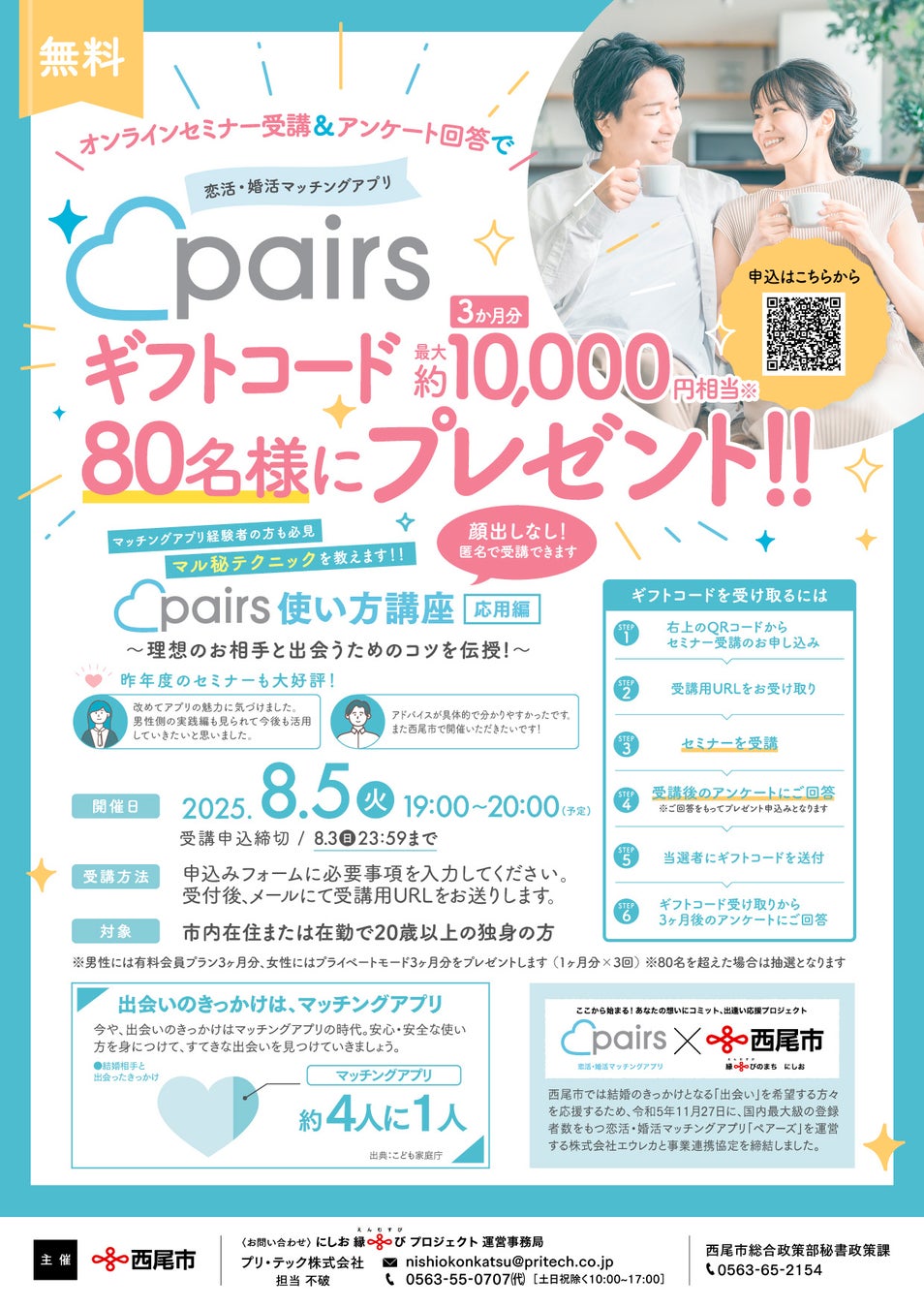 西尾市と事業連携協定を締結している株式会社エウレカ(本社:東京都港区)が運営する、国内最大級のマッチングアプリ「ペアーズ」のギフトコードのプレゼントを実施し、オンラインによる新たな出会いを創出します。