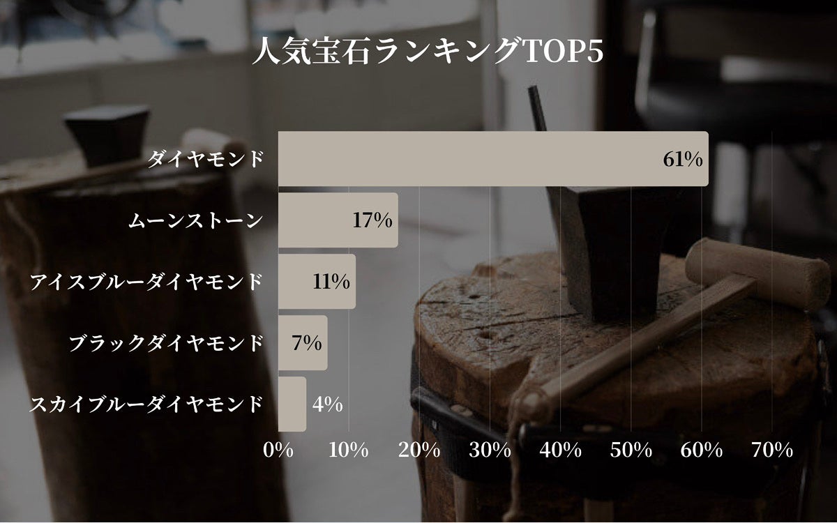 「ダイヤモンド」が全体の6割超を占め、ジュエリーにおける王道の人気を再確認する結果となりました。一方で、「ムーンストーン」や「アイスブルーダイヤモンド」など、個性や色味を重視した選択も目立ち、多様なニーズに応えるラインナップの重要性がうかがえます。最近ではカラーストーンを選ぶカップルも増加傾向にあり、オリジナリティを重視する傾向がより顕著になっています。