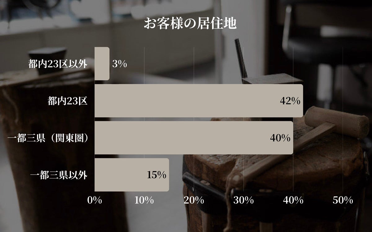 来店客の多くは都内23区(42%)と関東圏(一都三県・40%)からで、アクセスの良さが選ばれる理由の一つと考えられます。また、遠方からの来店(15%)も一定数あり、特別な体験としての指輪づくりが広く支持されていることがうかがえます。観光や記念日を兼ねた来店も多く、代官山という立地の魅力が来店動機にもつながっていると考えられます。