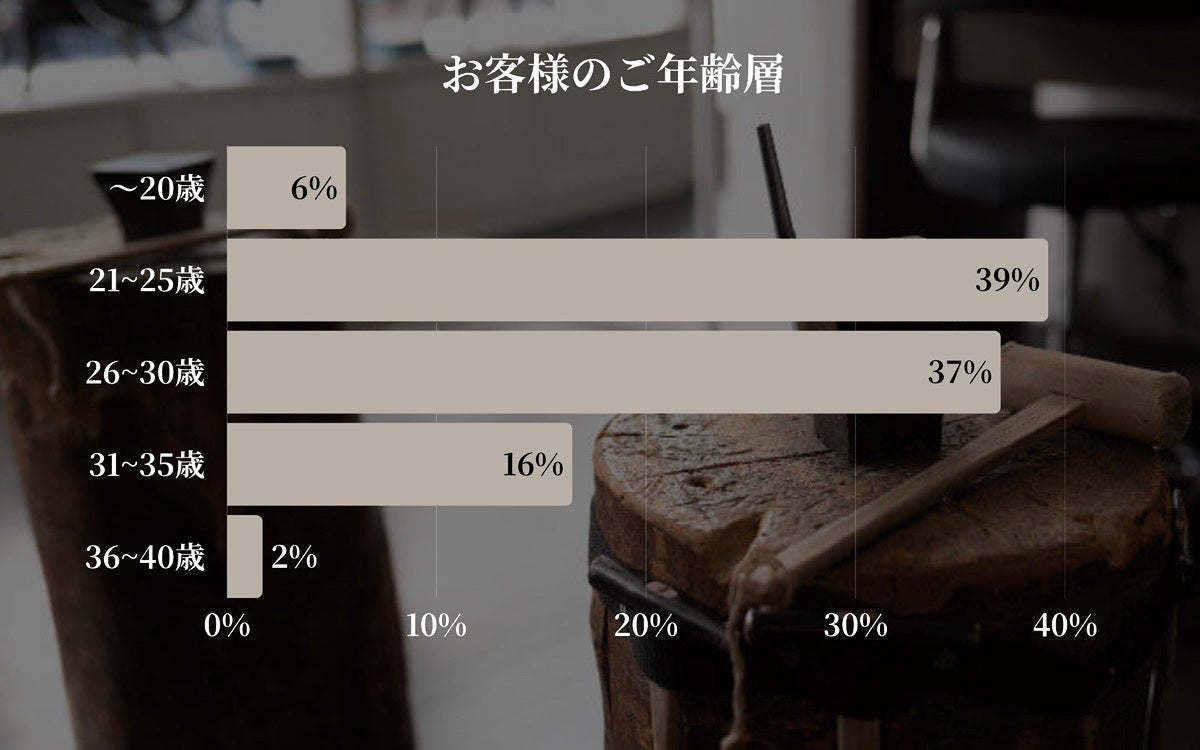 来店者の中心は20代で、21〜25歳(39%)と26〜30歳(37%)が大半を占めています。記念日を機にペアリングを手づくりするという体験が、若年層に強く支持されていることがわかります。31〜35歳(16%)の来店も一定数あり、幅広い世代に手作りリングの魅力が広がっています。