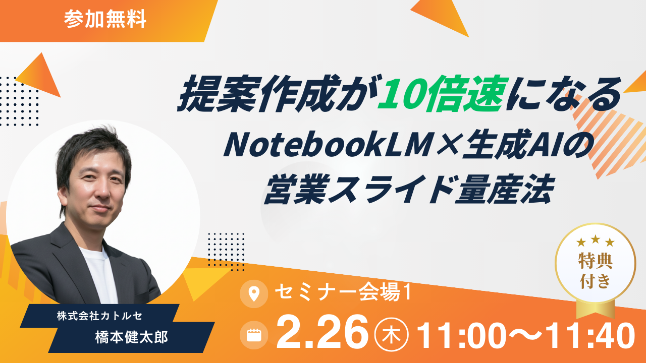 【2/26(木)展示会セミナー登壇】提案作成が10倍速になる:NotebookLM×生成AIの営業スライド量産法