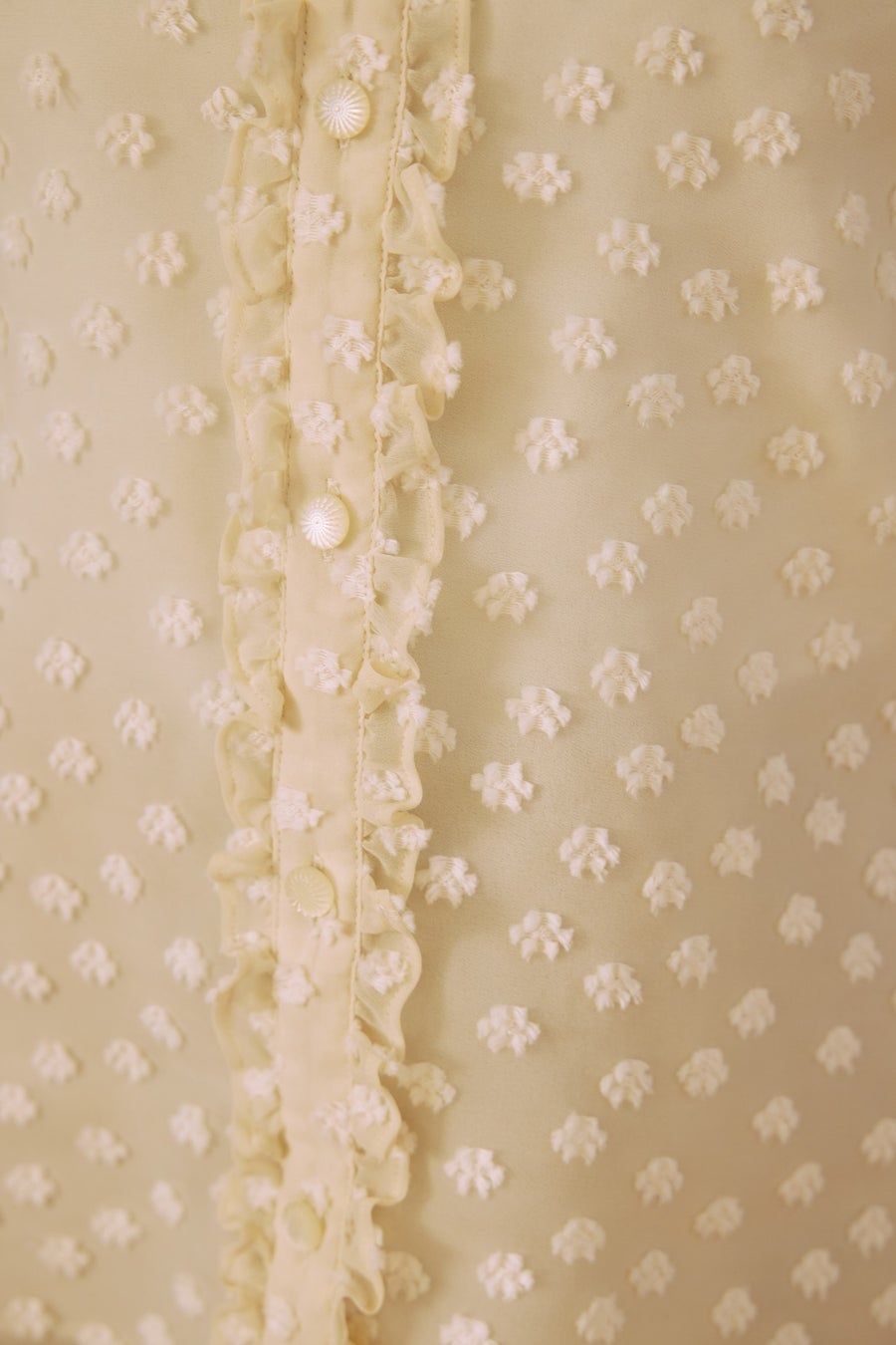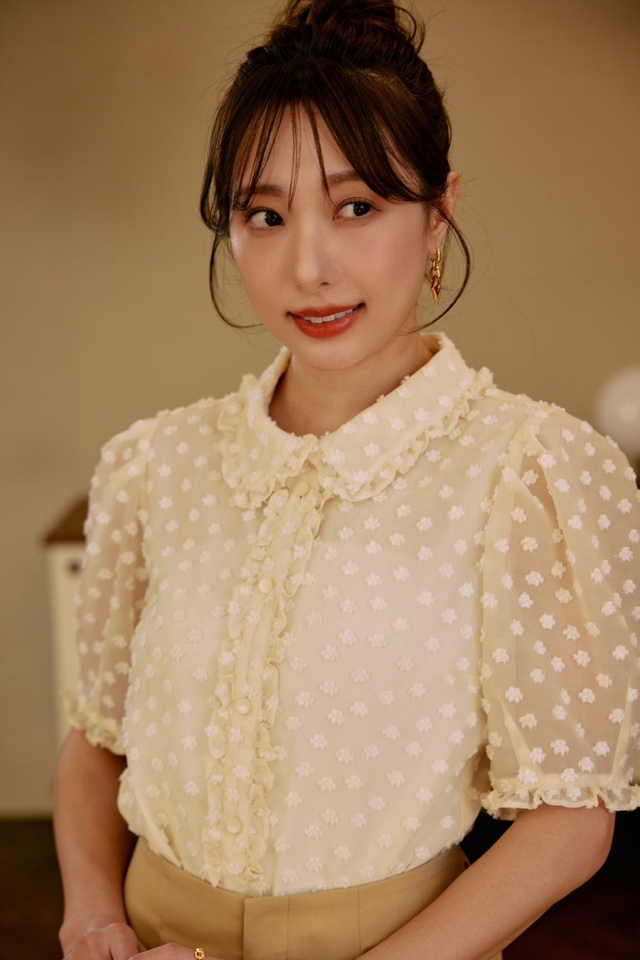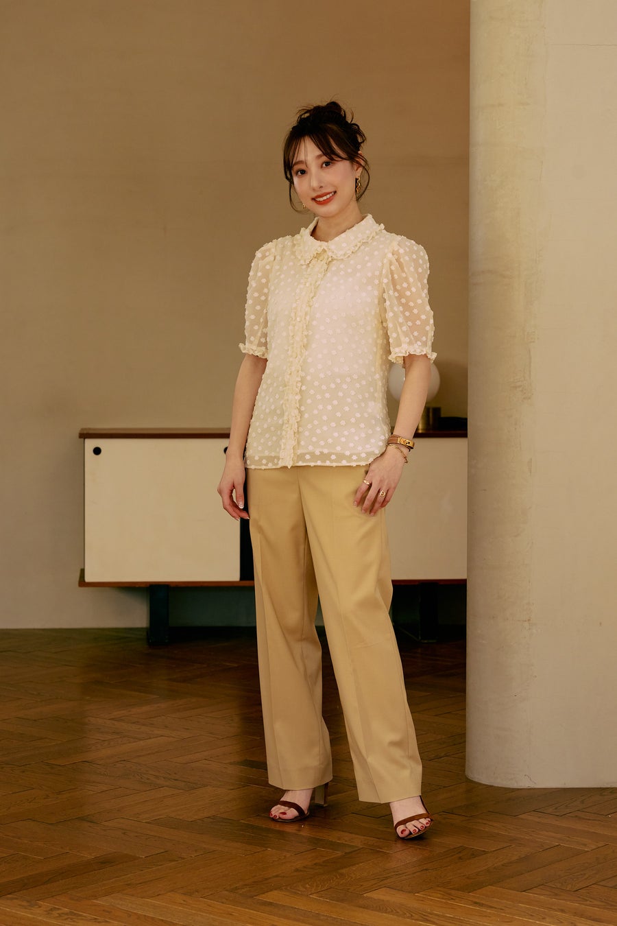 柔らかなニュアンスのあるクリームカラーが、肌になじみながらも上品さを醸し出してくれます。フリルは大人が着やすいバランスに。今っぽさを感じられるよう、透け感のある生地を重ねて軽さと奥行きを出しました。繊細な彫りを施したボタンにも注目。ボトムインでエレガントに、アウトスタイルでもカジュアルすぎないよう考えられた、こだわりの詰まったブラウスです。