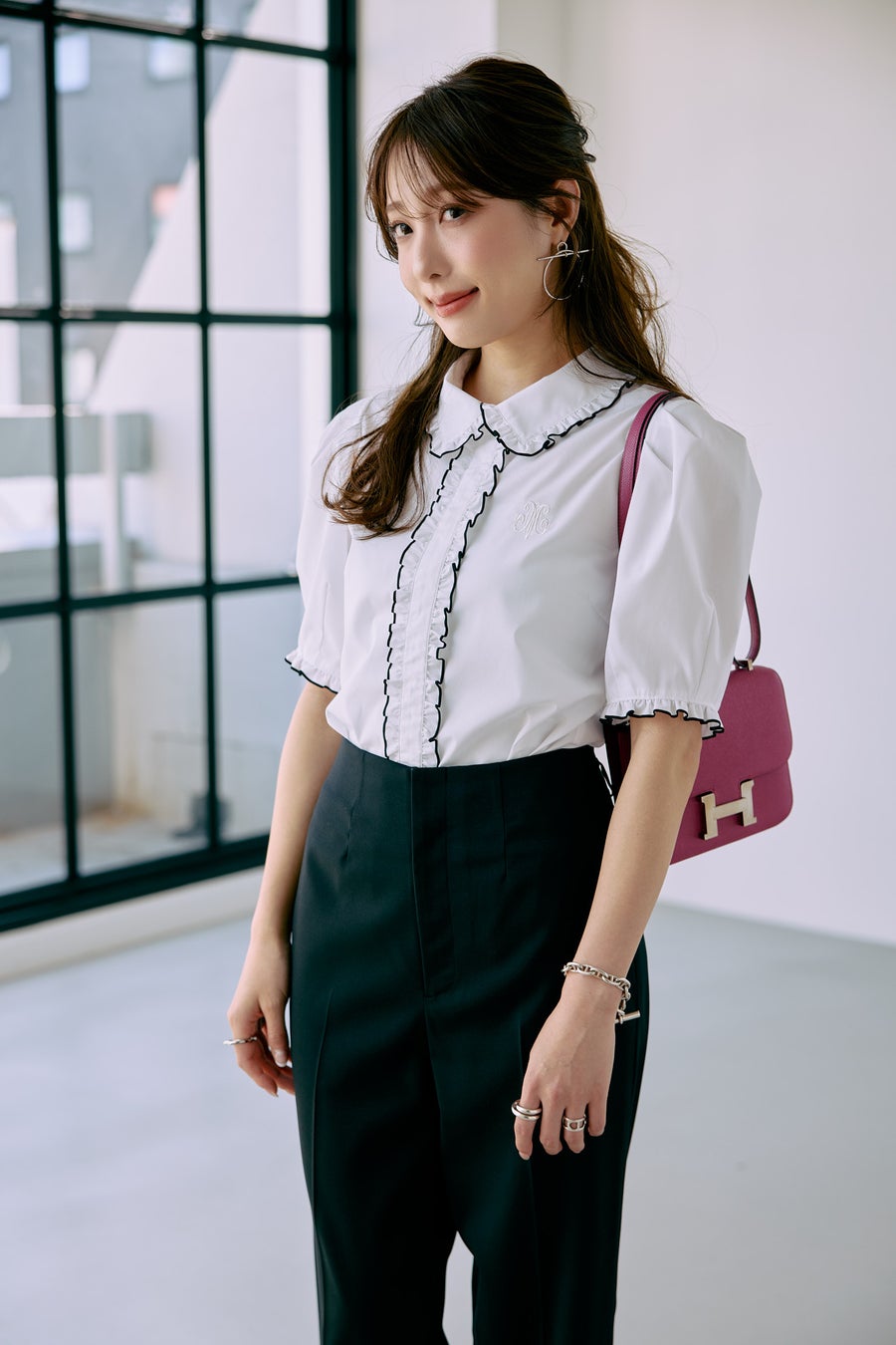 ホワイトは、ブラックの配色メローをあしらいフリルの立体感をより引き立てた1枚。甘さの中に効いたモードなエッセンスが、洗練さを与えてくれます。