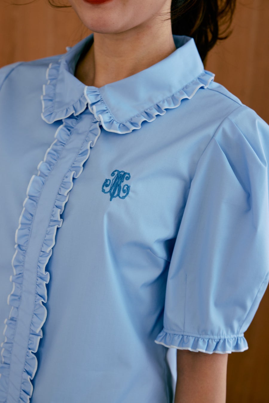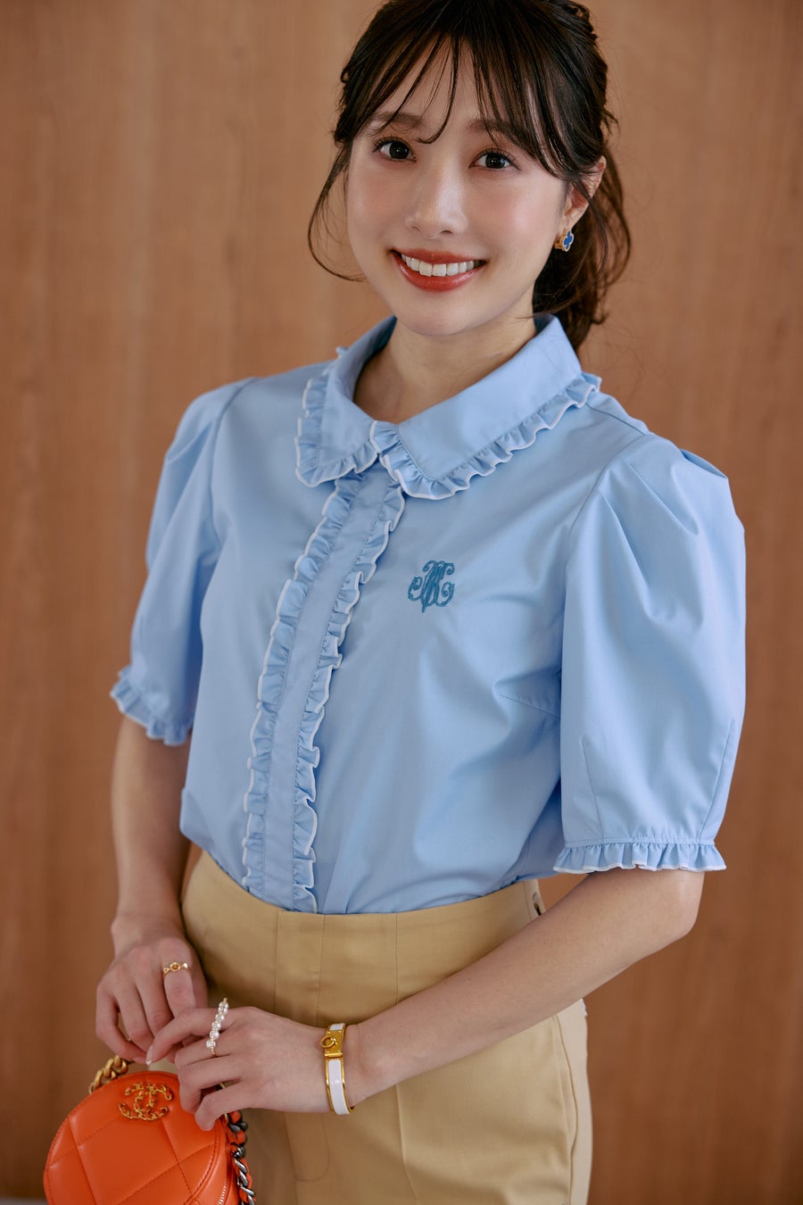 夏に映える軽やかさと爽やかさを兼ねそろえた冨張さん一押しのサックスカラー。襟と袖口にあしらった小ぶりなフリルとメローがさりげない表情を添え、甘さを抑えながらも華やかで上品な印象に。