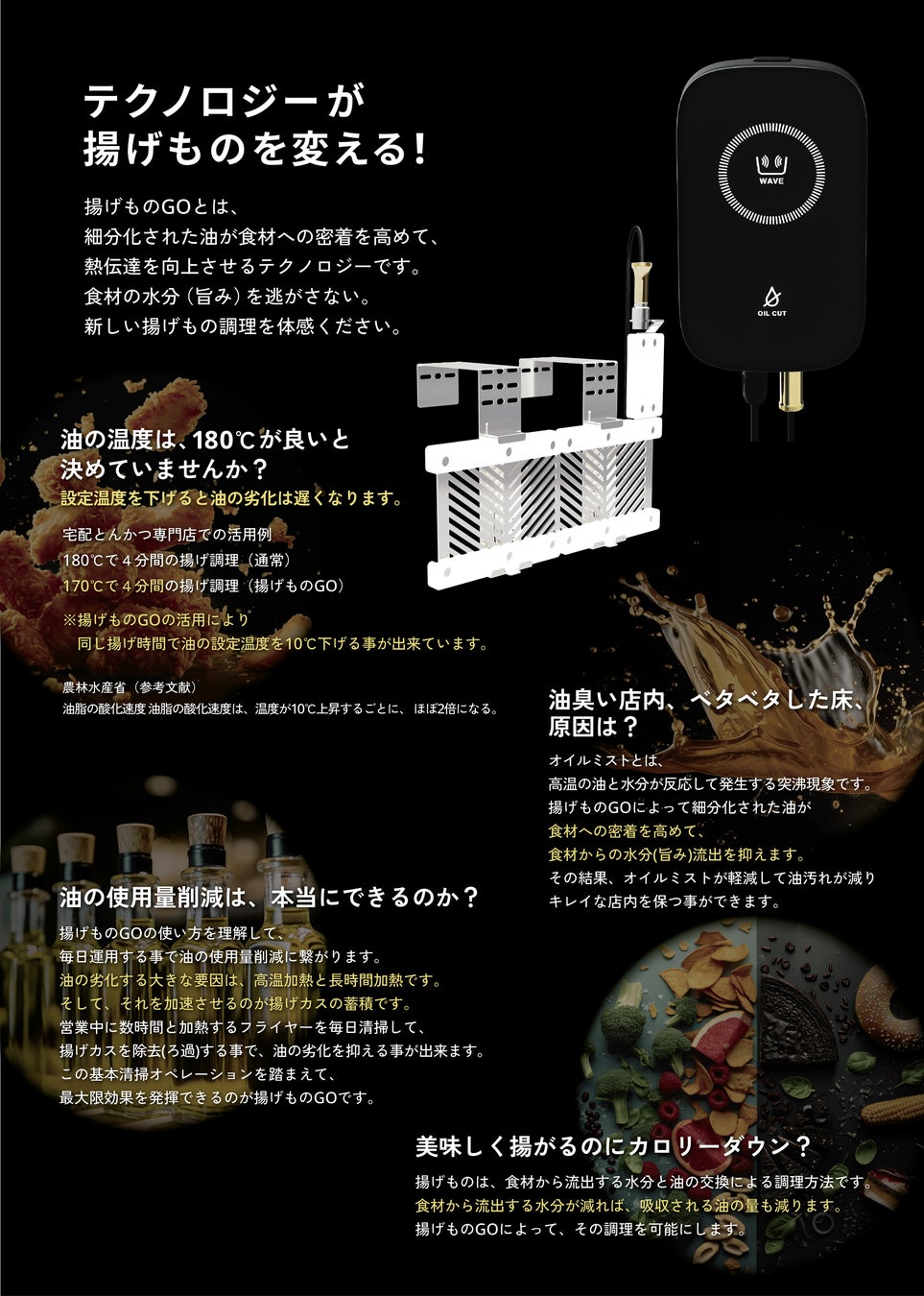 「揚げものGO」は、油を細分化して熱伝達を向上させることができる技術を搭載した、揚げ物調理補助機です。
