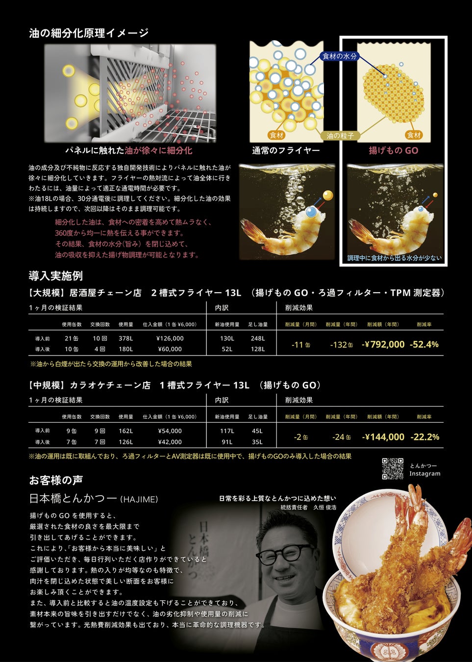 今後は、日本で新規出店する全ての店舗に、業務用フライヤー後付けデバイス「揚げものGO」の導入を予定しております。