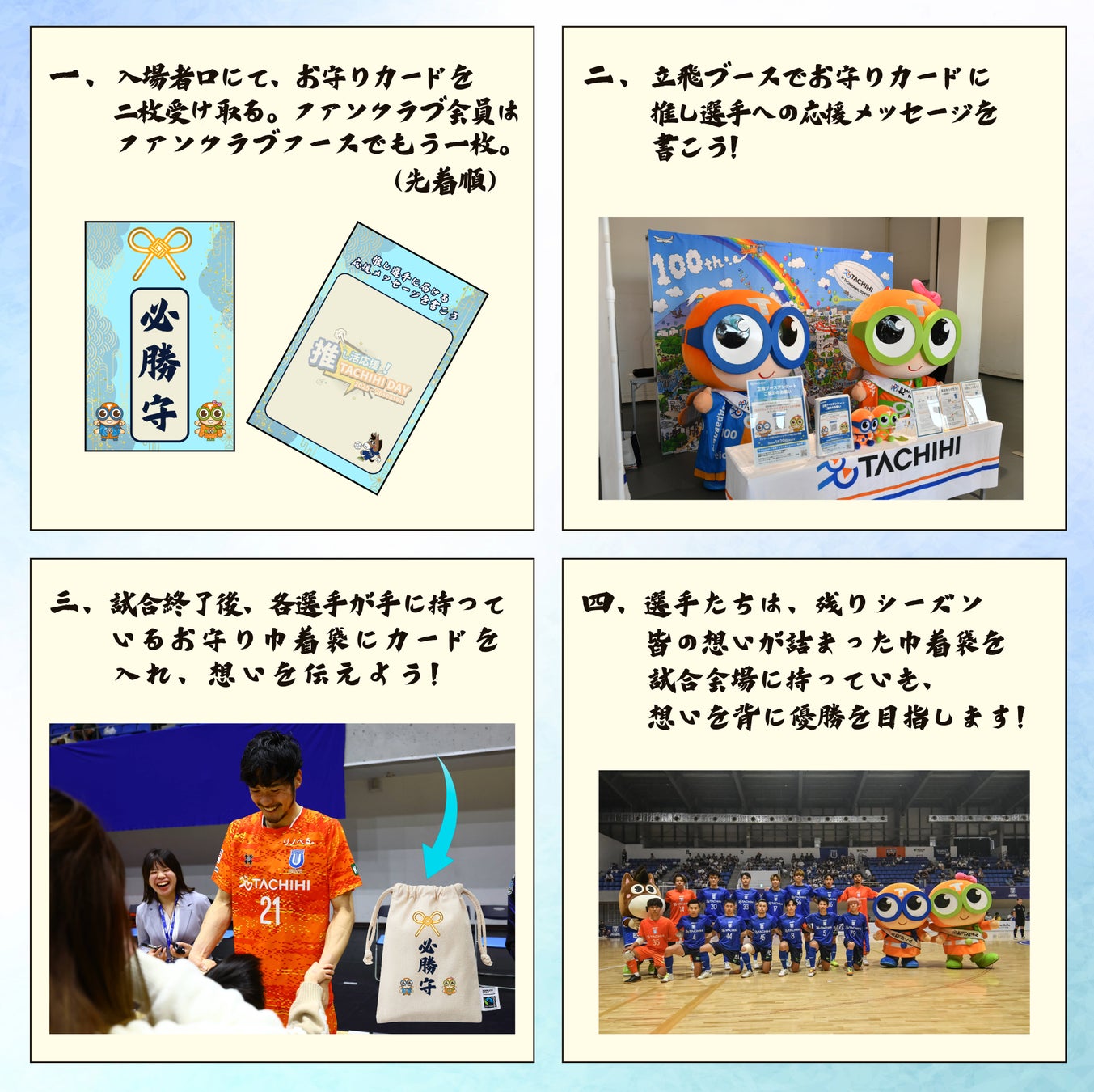 試合終了後には、コート上で選手に直接お守りカードをお渡しできる交流イベントも実施予定です。選手に想いを届けて、エールを送ろう!!