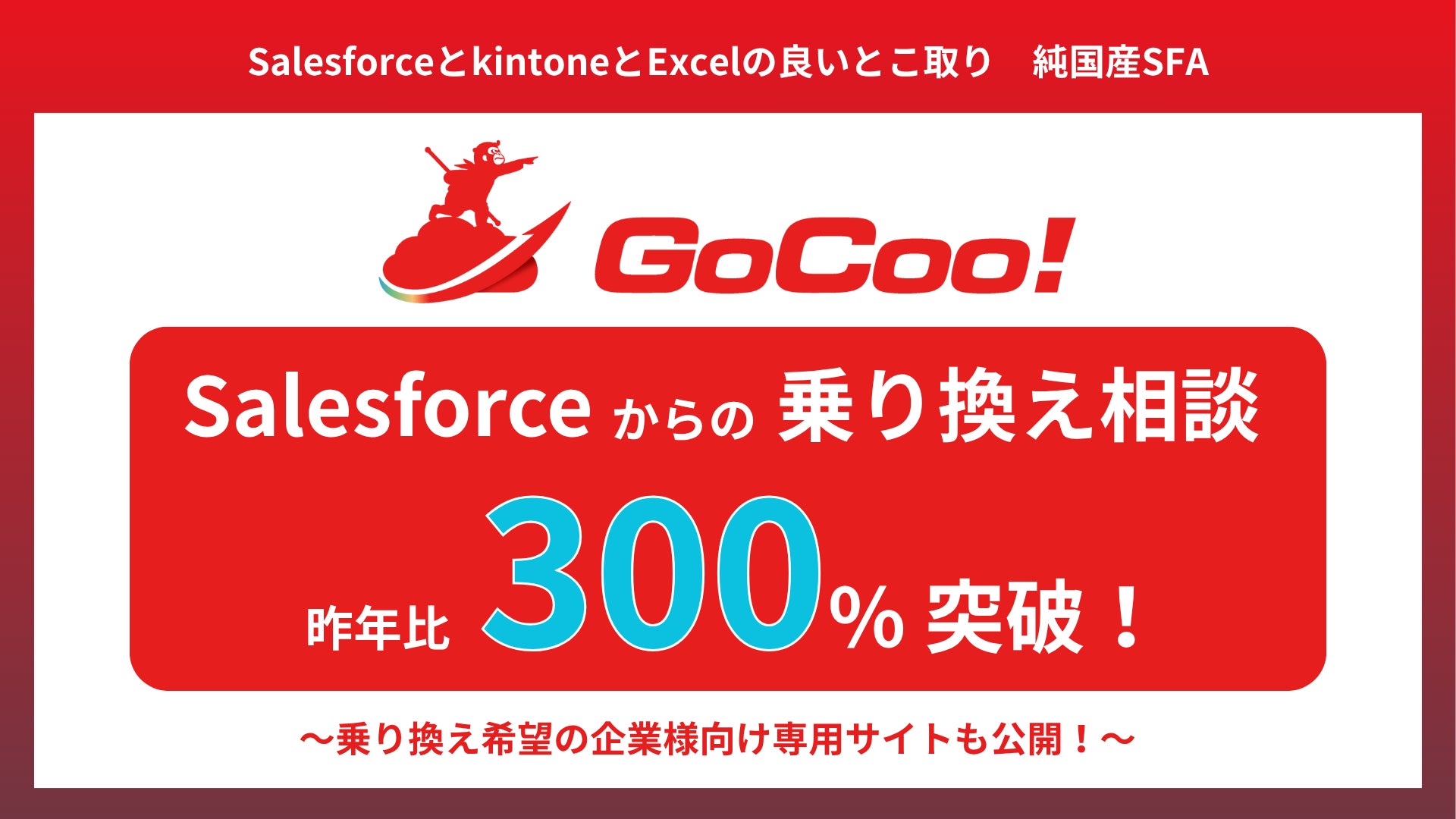 純国産SFAを活用した営業DX/AX※1サービスを提供するSALES GO株式会社(セールスゴー、所在地:東京都中央区、代表取締役社長:内山 雄輝)は、提供する純国産SFA「GoCoo!」においてSalesforceからの乗り換え相談実績が前年比300%※2を突破したことをお知らせします。これを期に、Salesforceから乗り換えを検討中の企業様向けにより発信を強めるため、専用サイトを開設しました。