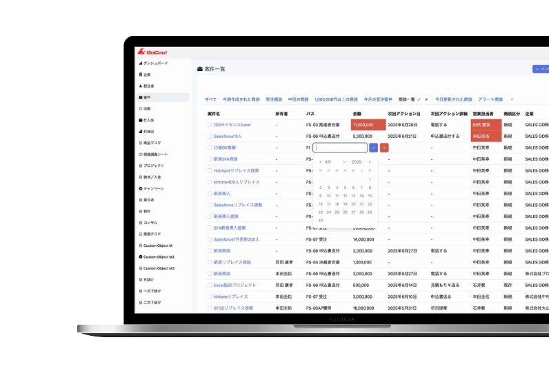 多くのツールでは、システムの仕様に合わせて業務を変える必要があり、営業現場に負担がかかりがちです。GoCoo!は、高いカスタマイズ性により「業務に寄り添うツール設計」を実現し、現場の負荷を最小限に抑えながら、スムーズな運用定着へ導きます。