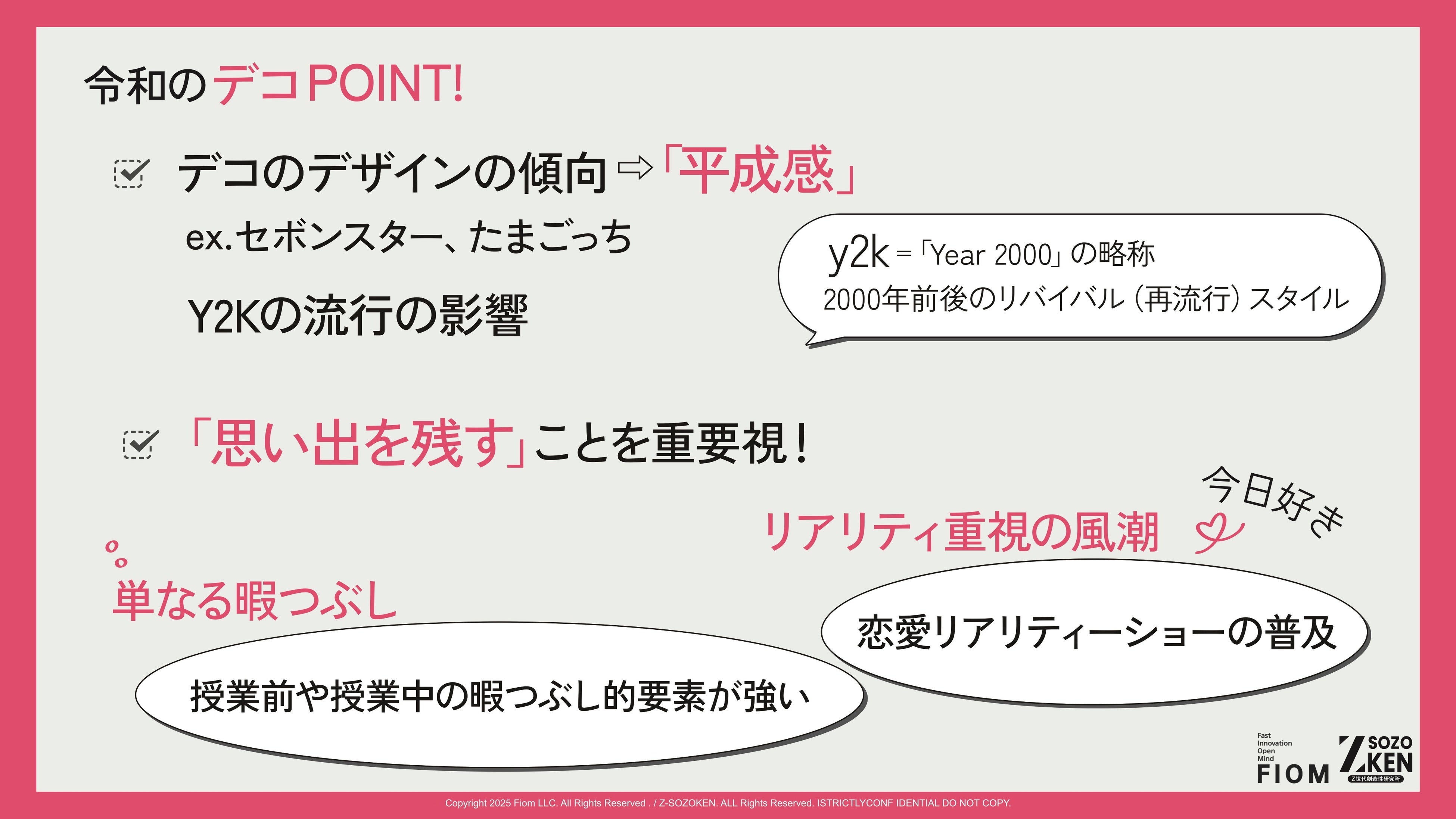 Z世代に特化したクリエイティブカンパニーFiom合同会社(本社:東京都渋谷区、代表社員:竹下洋平)が運営しているZ世代の実態や価値観を分析するシンクタンク、Z-SOZOKEN(Z世代創造性研究所)は、2026年3月18日(水)にZ-SOZOKEN THINKTANK 最新調査研究レポートの第3弾として『Z世代のデコ文化』についての調査研究レポートの第8章インサイトサマリー「令和版デコPOINT!」をリリースしました。