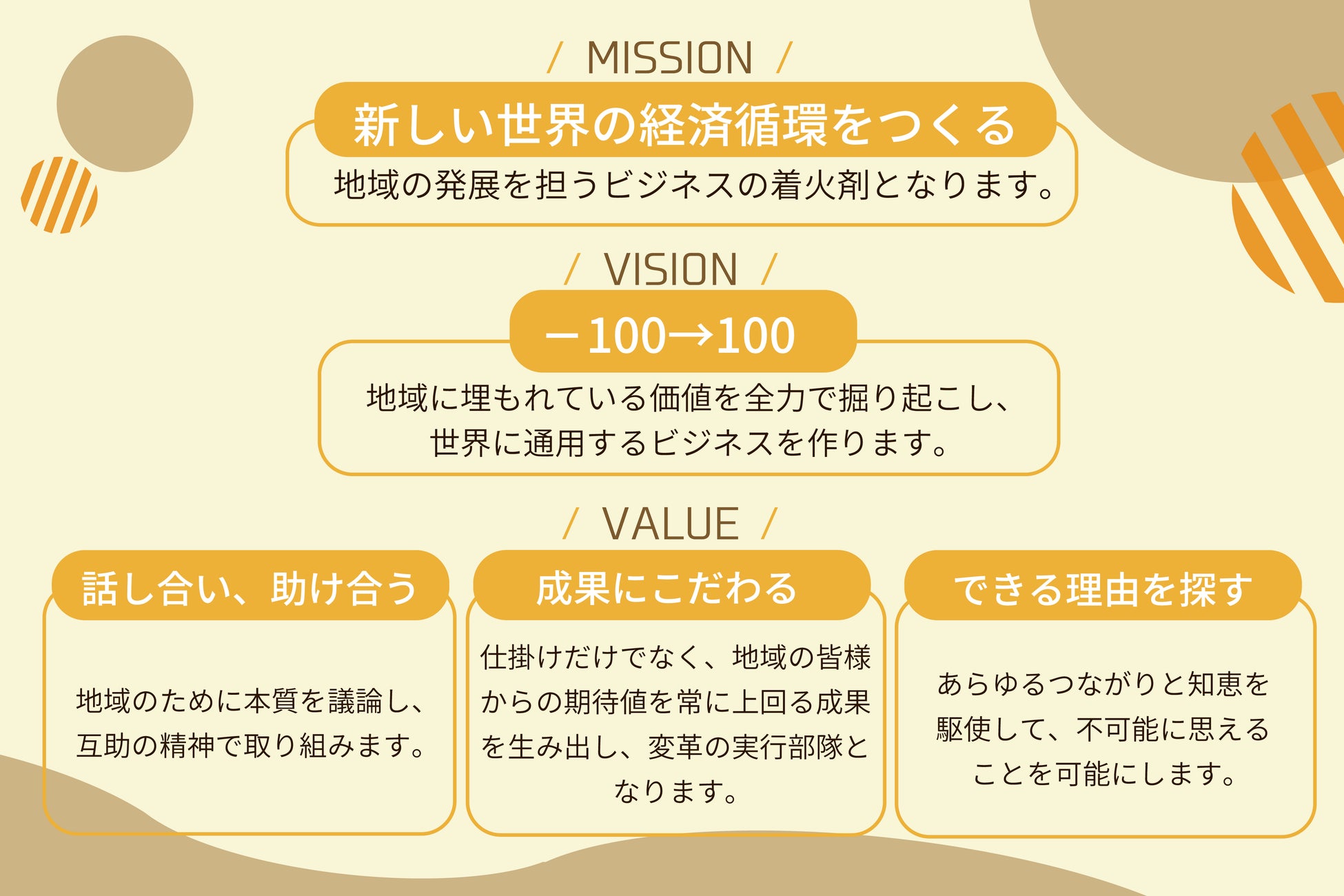 『新しい世界の経済循環をつくる』というミッション、『-100→100』というビジョンのもと、地域に根差す・地域の課題を解決するスタートアップやインパクトスタートアップに投資を行っています。