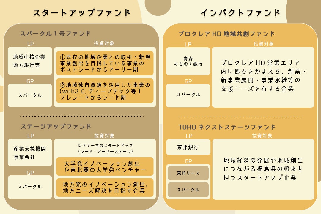 青森みちのく銀行を傘下に持つプロクレアHDとスパークル株式会社が協力し、地域に根ざした企業やインパクトスタートアップを支援することを目的として2023年に設立いたしました。青森・北海道・秋田・岩手・宮城に根ざす中小企業やインパクトスタートアップを対象にしています。