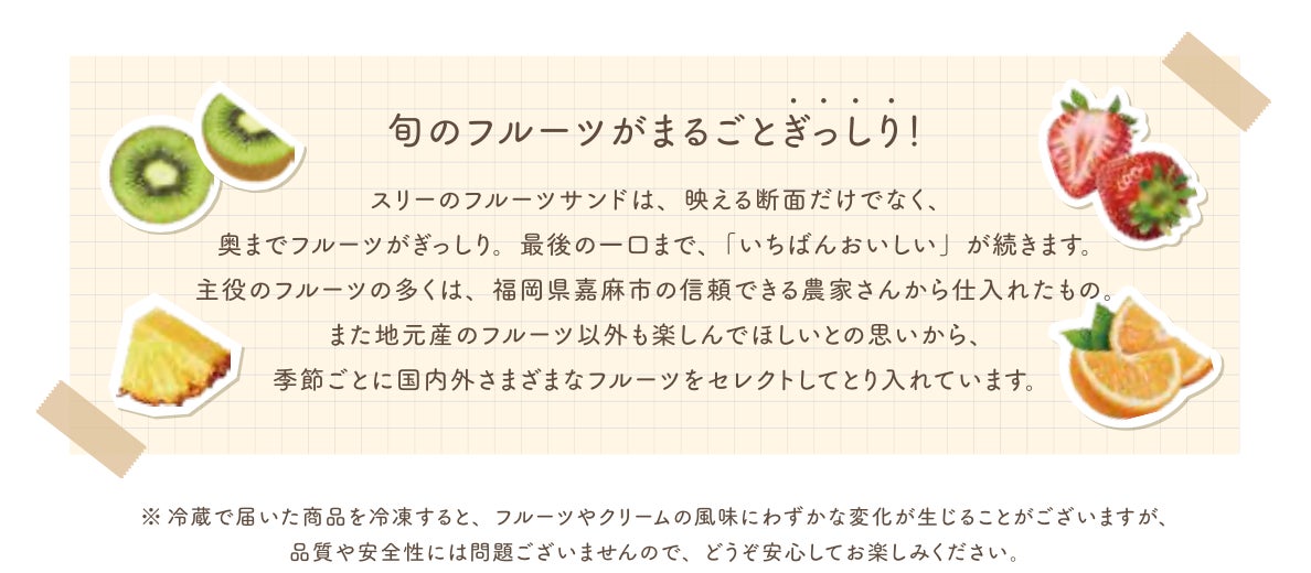 フルーツの水分・風味を保ちつつ配送後も美味しさを維持するために、独自の「低糖質ホイップクリーム」や解凍方法の研究・開発を重ねてきました。その結果、冷凍解凍後も**「見た目・味・食感」三拍子そろった商品**として、全国発送が可能となりました。