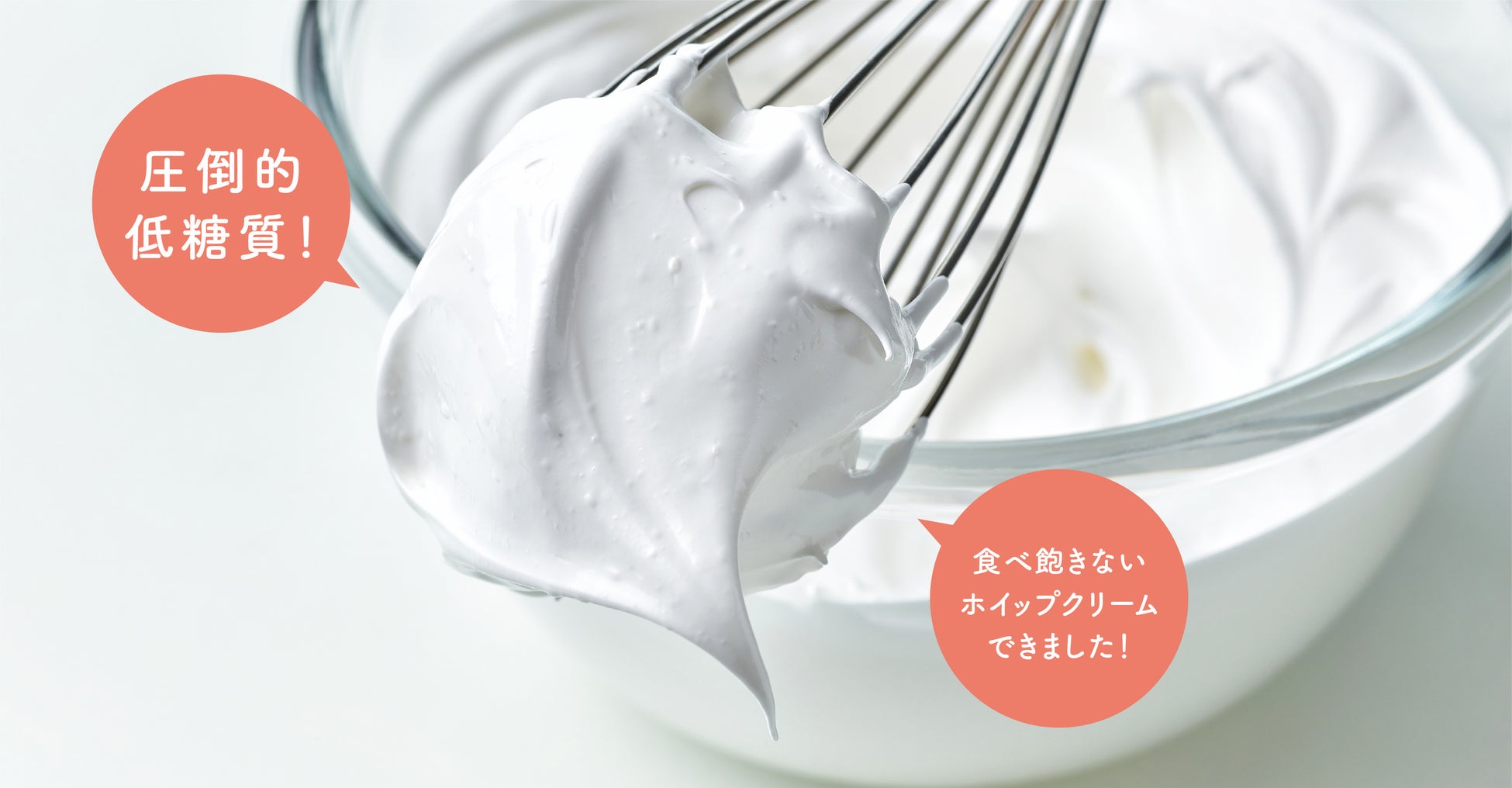 砂糖を使用せず、カロリーゼロでありながら砂糖と同じ甘さを持つ自然派甘味料「ラカント」を配合。ウリ科の植物「羅漢果(ラカンカ)」の高純度エキスと、天然甘味料成分である「エリスリトール」を絶妙なバランスで組み合わせ、砂糖に近い甘さを実現しました。さっぱりとした軽い口当たりで、最後まで食べ飽きない低糖質ホイップクリームです。