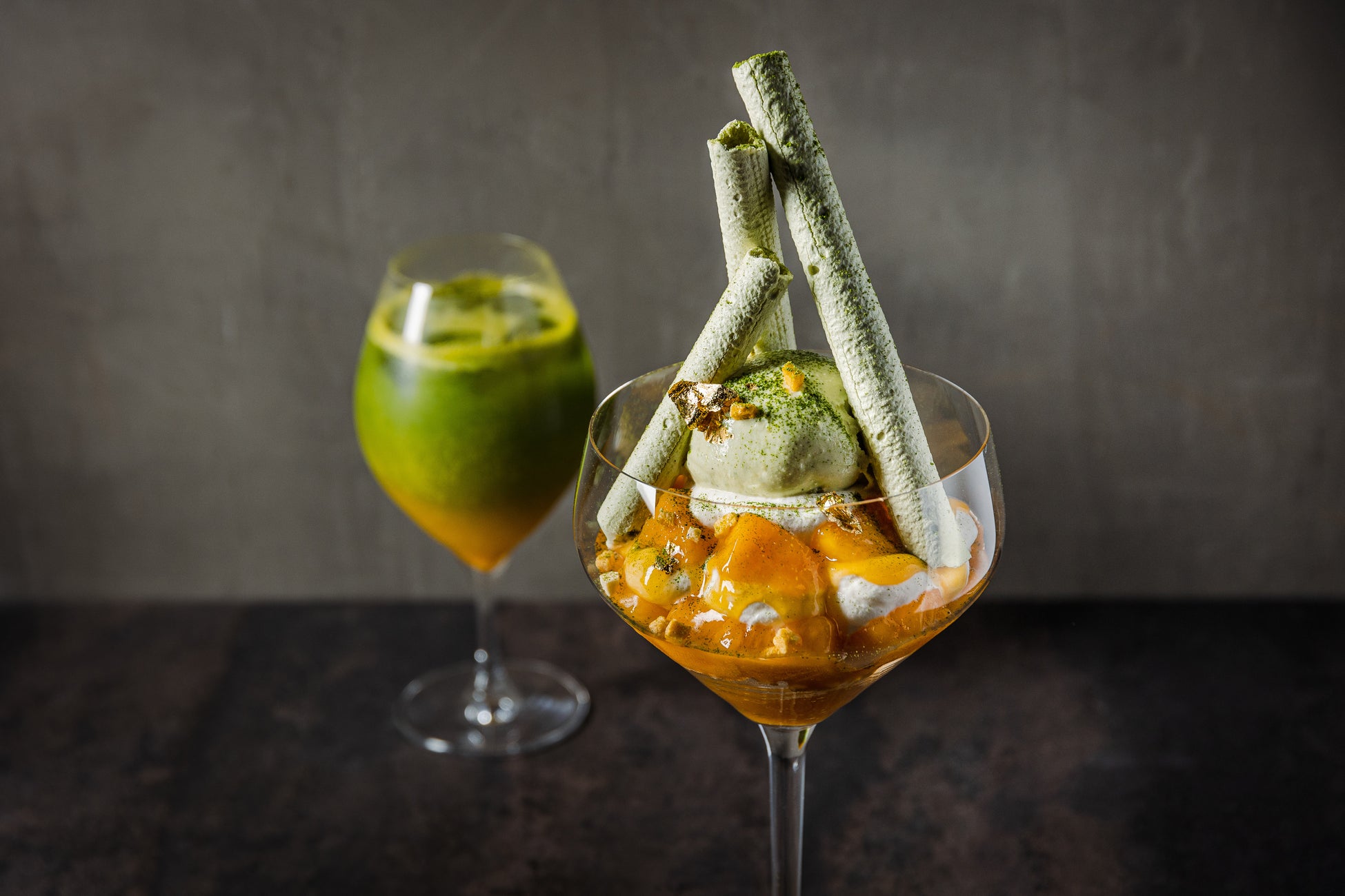 宮崎県産の完熟マンゴーと八女の白折茶を合わせたティラミス仕立てのパフェ。 日本酒飛鸞の貴醸酒とマスカルポーネの相性が美しく、マンゴーの爽やかさとお茶本来の香り高き余韻が清涼感を感じさせる上品かつ侘び寂びな味わいをお楽しみください。