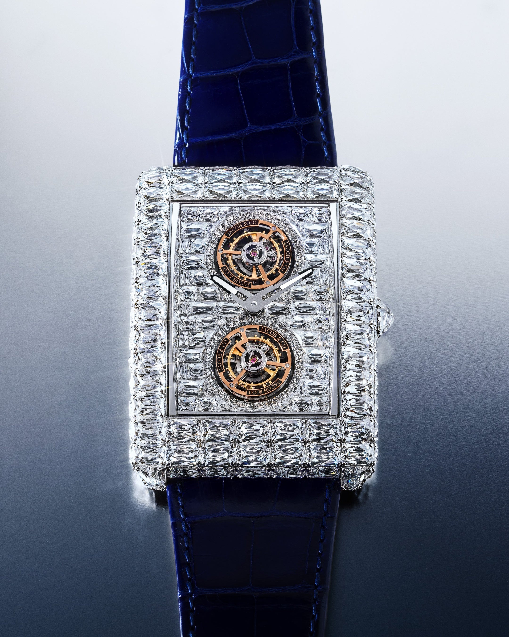 「ビリオネア ダブルトゥールビヨン エンジェルカット」は、ジェイコブ&コーが宝石表現においても革新を続けるブランドであることを示す作品です。創業40周年を記念して発表された特許取得済みの新たなダイヤモンドカット「エンジェルカット」を初めて採用し、光の反射そのものを設計するという、ハイジュエリー・タイムピースの新たな表現に挑んでいます。