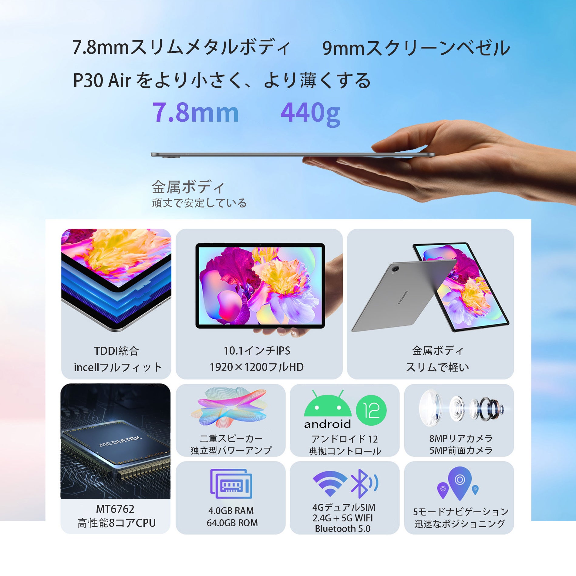 TECLAST P30air タブレットは、4G LET 通話または高速インターネット アクセスをサポートしています。 安定した通信を実現する2.4GHz/5GHz Wi-Fi対応。 GPS、Beidou、GLONASS、Galileo 4 衛星ナビゲーション システムをサポートし、A-GPS 支援ネットワーク ポジショニングをサポートし、迷子になることなく目的地に迅速かつ正確に到達できるようにします。 GPSナビ内蔵で外出先でも使えます。