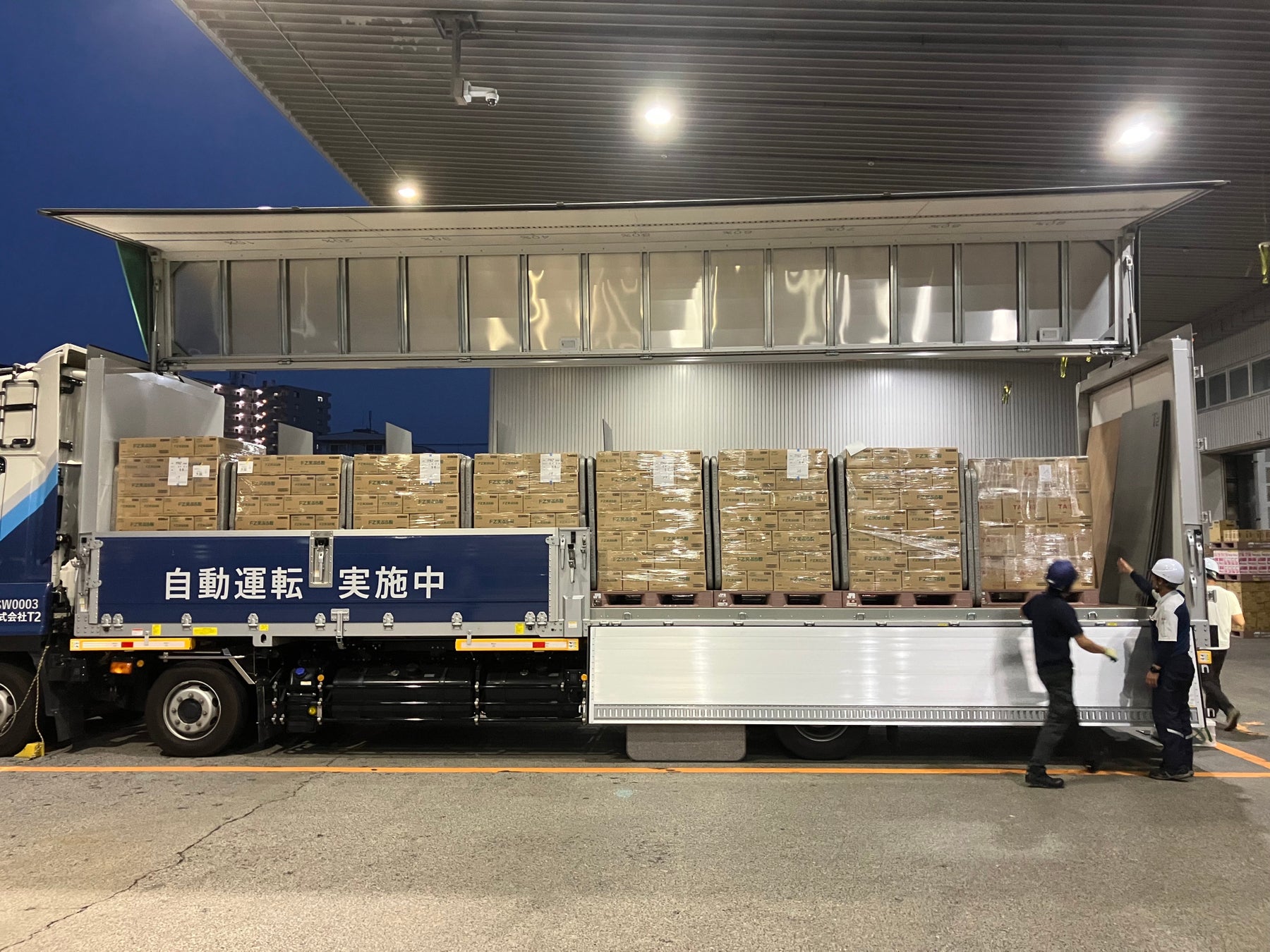 こうした見通しを踏まえて、F-LINEと、2027年にレベル4*⁴自動運転トラックによる幹線輸送サービスの開始を目指すT2は、本年2月から10月までの間、T2が開発したレベル2*⁵自動運転トラックを用いて上記6社の加工食品などの各種荷物を幹線輸送する実証に取り組んでまいりました。計5回にわたる実証において積載量を順次増やしていくとともに、昼間・夜間双方の時間帯で運行するなど、オペレーションおよび技術の両面で自動運転トラックの有効性を綿密に検証してきました。