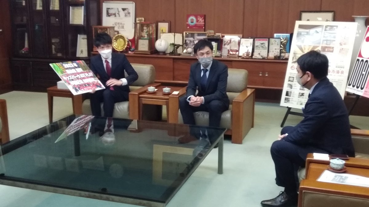 キスケ株式会社より田中取締役事業部長、岩﨑マネージャーが市役所へ表敬訪問をおこない無料招待の様子を報告しました。