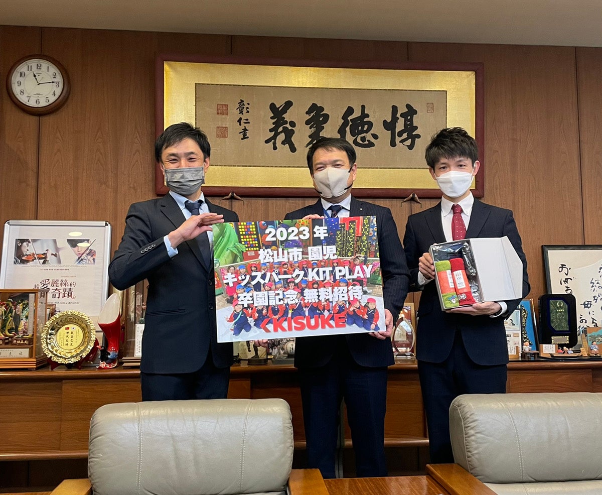 愛媛県松山市の幼稚園・保育園の卒園児を23施設693人を無料招待!キスケ株式会社より市役所へ表敬訪問をおこないました。