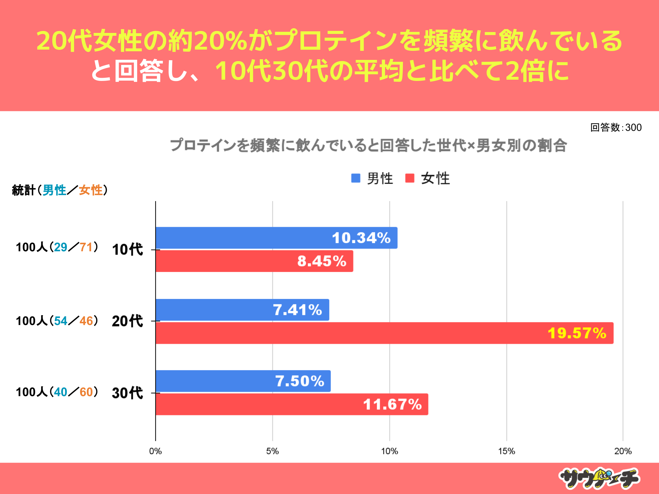 【20代女性の約20%がプロテインを頻繁に飲んでいると回答し、10代30代の平均と比べて2倍に】