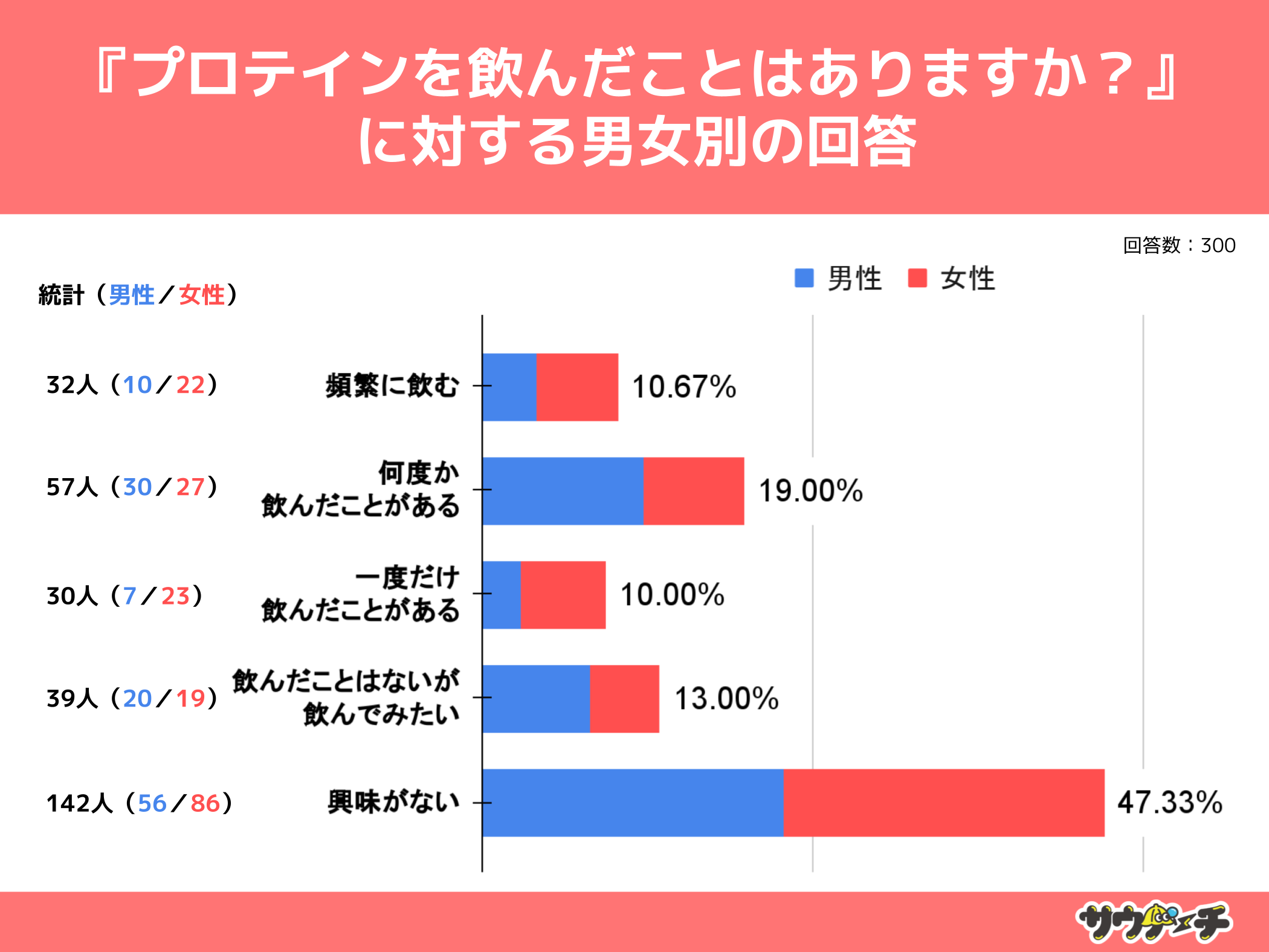 10〜30代男女を対象とした『プロテインを飲んだことはありますか?』というアンケートで、最も多かった回答は「興味がない」で47.33%でした。