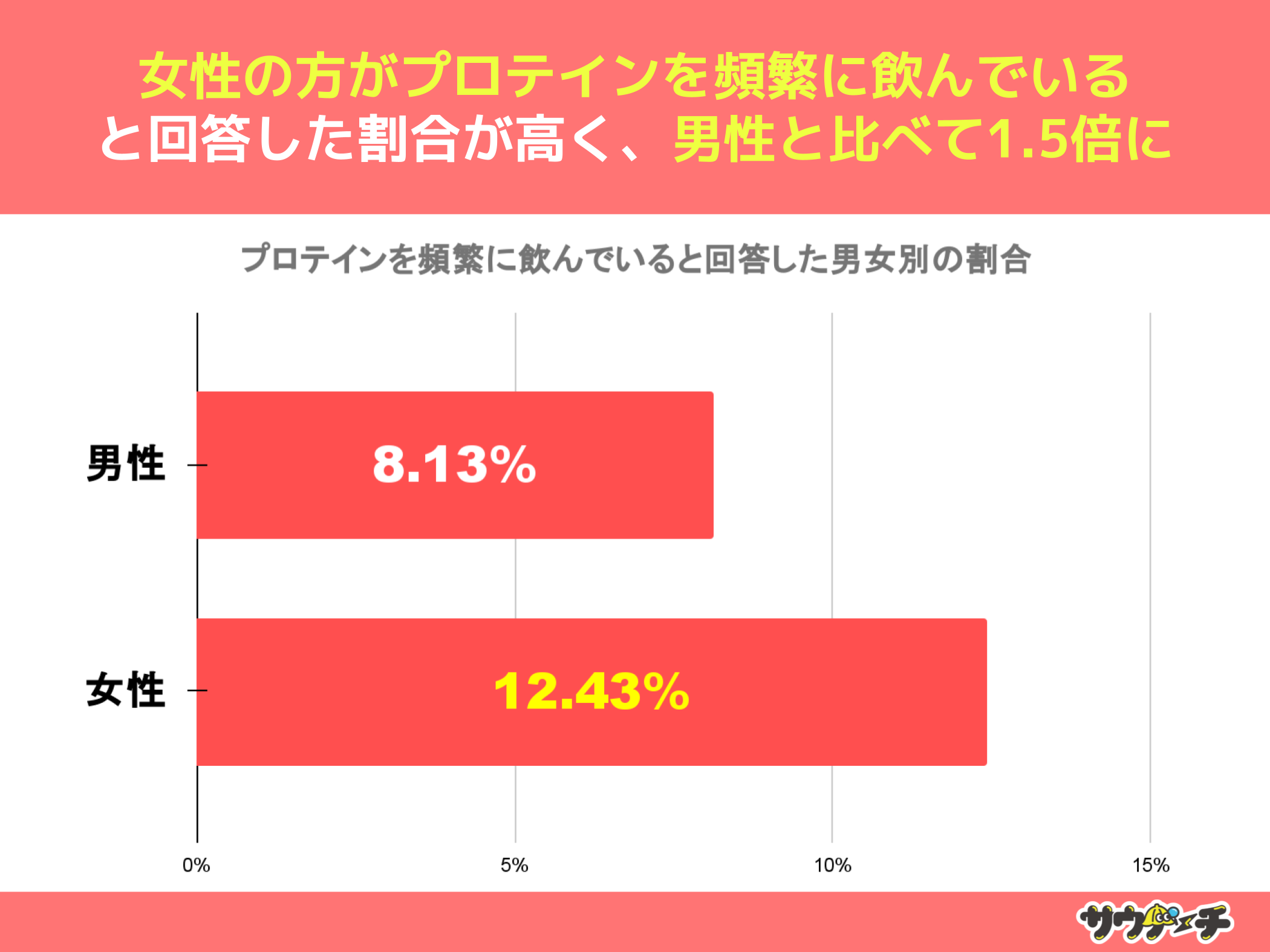 プロテインを頻繁に飲んでいると回答した割合を男女別でみてみますと、女性が12.43%、男性が8.13%で、男性と比べて女性は1.5倍高い結果となりました。