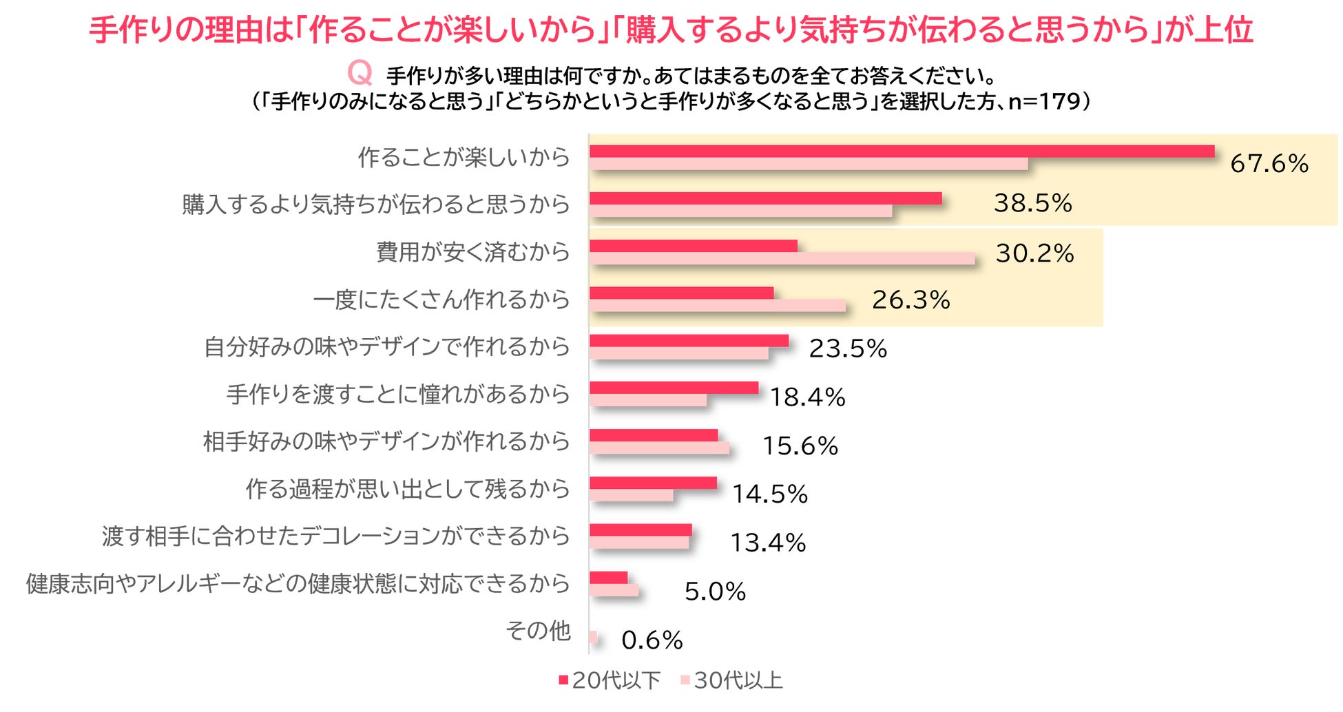 手作りを選ぶ理由を聞いたところ、全体でみると「作ることが楽しいから(67.6%)」「購入するより気持ちが伝わると思うから(38.5%)」が上位を占め、特に10~20代で多いことがわかりました。一方、30代以上は「費用が安く済むから(45.3%)」「一度にたくさん作れるから(30.1%)」が比較的多く、主婦層は金銭面も手作りを選ぶ理由として高い傾向にありました。