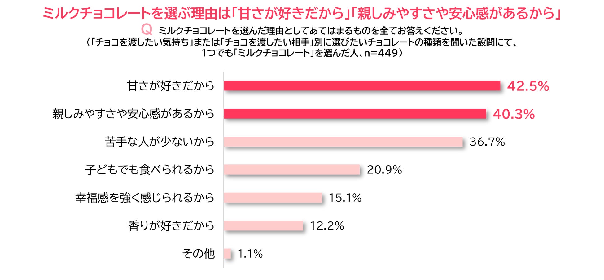 また、好きの気持ち・感謝の気持ちを伝えるにも、甘さ・親しみやすさ・安心感を理由に「ミルクチョコレート」の支持が圧倒的1位の結果になりました。