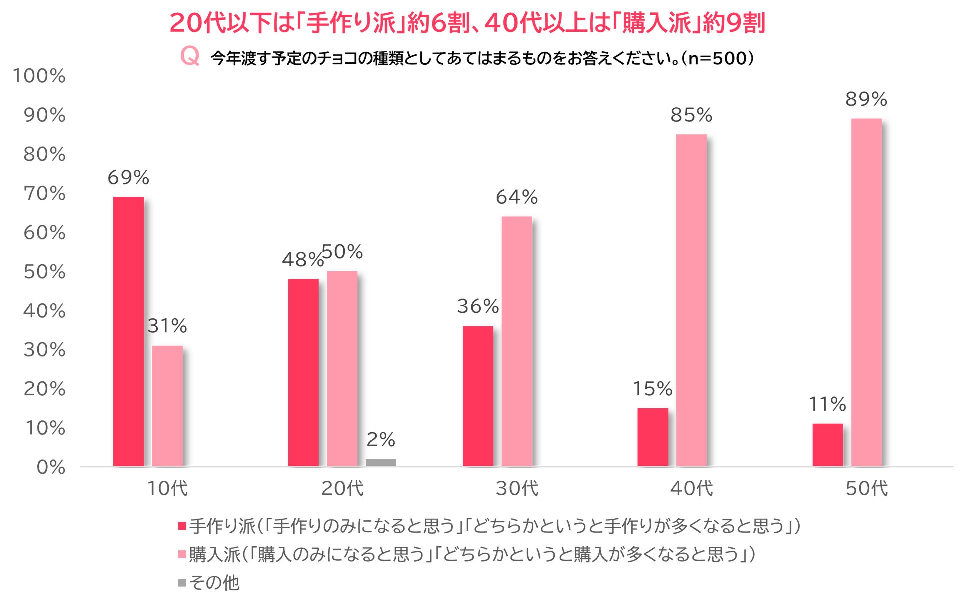 年代別にみると、20代以下は「手作り派」が多く約6割にのぼり、反対に40代以上では「購入派」が約9割にのぼり、若年層になればなるほど「手作り派」が多くなる傾向があることがわかりました。なお背景には、10代の86%が友人に今年チョコレートを渡す予定と回答しており、いまだ根強い友チョコ文化がアフターコロナで完全復活したことも一因として考えられます。