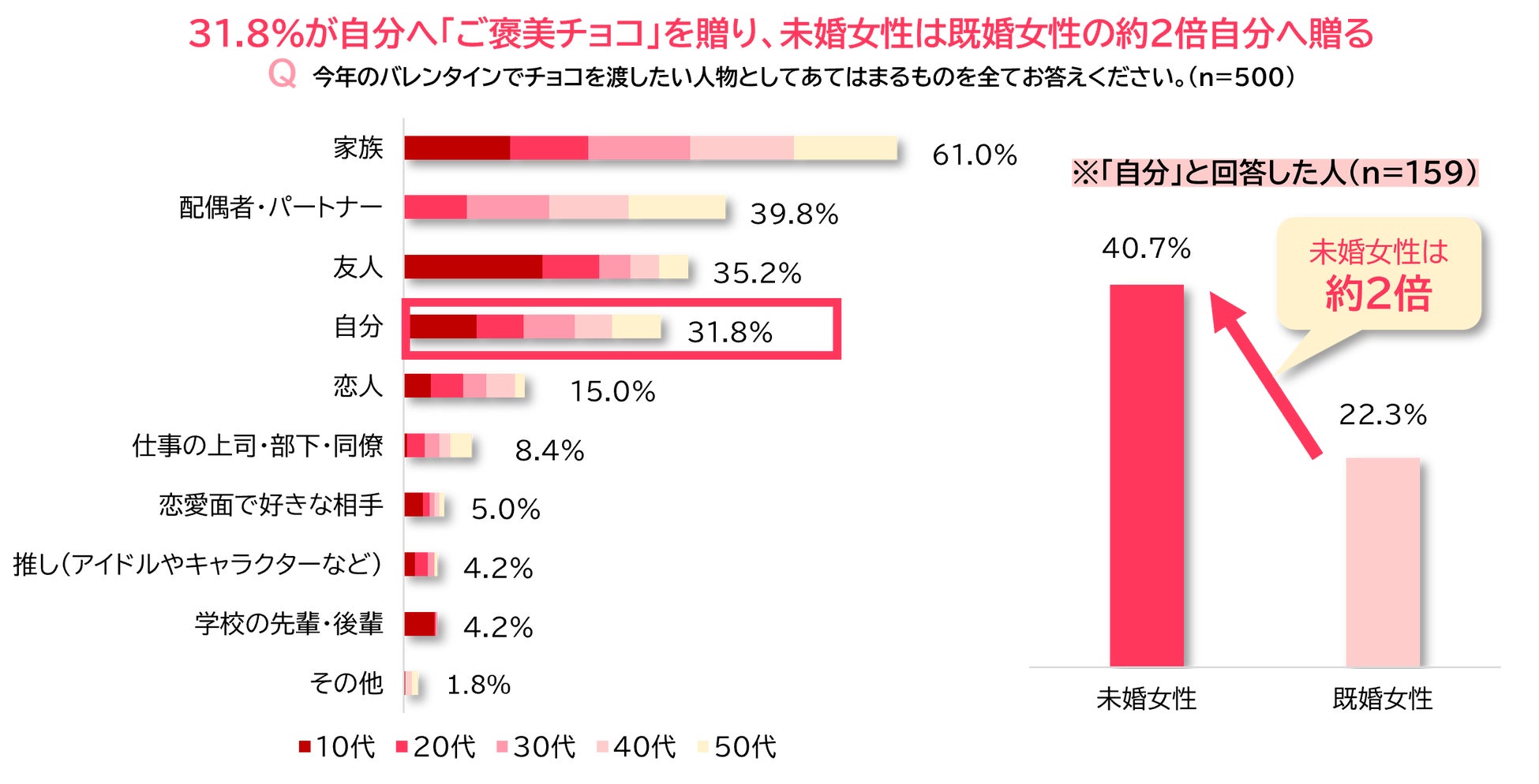 今年のバレンタインでチョコレートを渡したい人物を聞いたところ、「自分」と回答した人が全体の31.8%となり、世代別にみると10代が45.0%と最も多く、若年層にも自分用にチョコレートを買う「ご褒美チョコ」文化が浸透していることがわかりました。