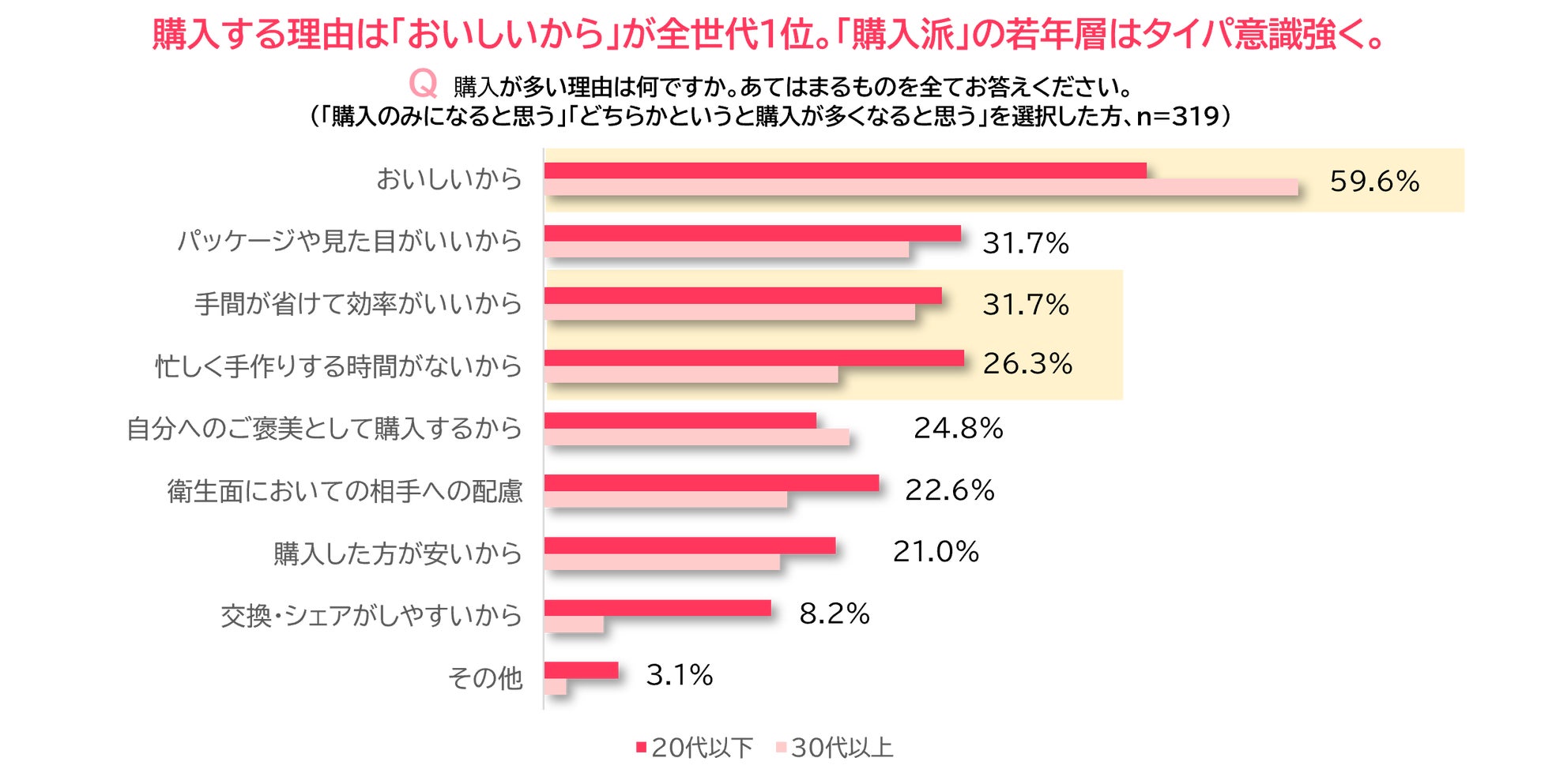 購入を選ぶ理由については、「おいしいから」が特に30代以上で多く、全世代で1位に。また、「手作りする時間がないから(35.0%)」「購入の方が効率がいい(33.1%)」と、タイムパフォーマンスを考えて購入を選んでいる人は20代以下の方が割合が大きい傾向にあることもわかりました。