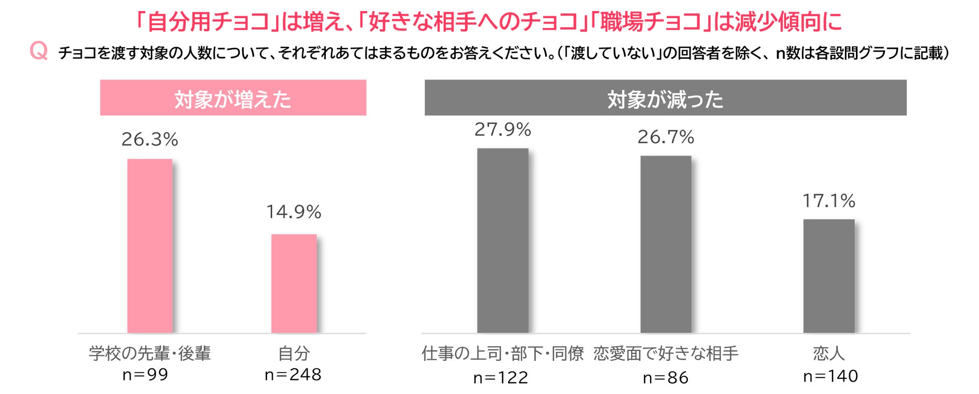 実際に今年のバレンタインでチョコを渡したい人物を聞いたところ、「家族(61.0%)」「配偶者・パートナー(39.8%)」「友人(35.2%)」等身近な人が上位に並び、「恋愛面で好きな相手」はわずか5%と1割未満にとどまりました。ここ2~3年でのチョコを渡す人数の変化について、渡す相手別にみても、渡す人数が比較的“増えた”のは「学校の先輩・後輩(26.3%)」「自分(14.9%)」で、“減った”のは「仕事の上司・部下・同僚(27.9%)」「恋愛面で好きな相手(26.7%)」「恋人(17.1%)」という結果に。