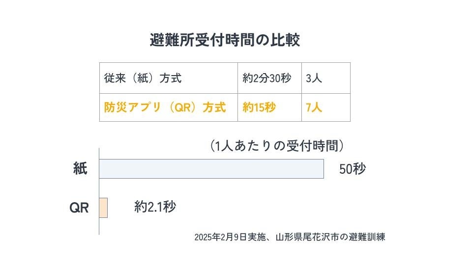 災害時の避難所では、多くの人が一斉に受付を行うため、スムーズな対応が求められます。「ポケットサイン防災」を活用した二次元バーコードによる避難所受付を行った結果、従来の紙による受付と比べ、約24倍のスピードでチェックインを完了できることが確認されました。