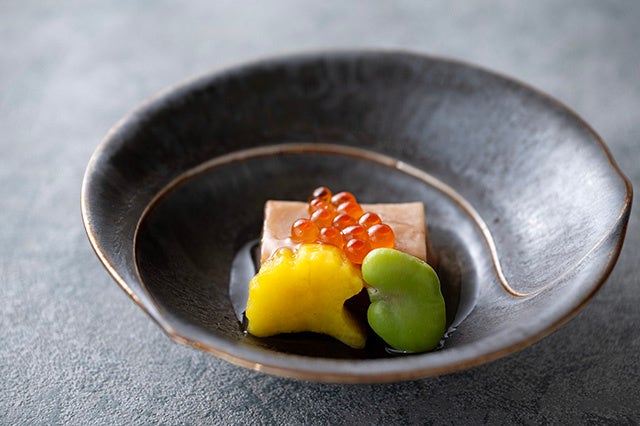 押し豆腐 胡瓜 黄身酢 花穂紫蘇