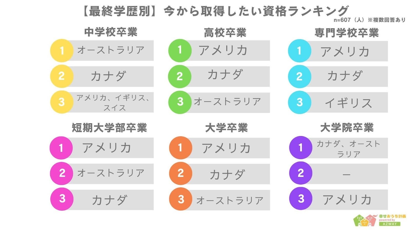 また、最終学歴別に「子どもに行ってほしい国」を見たところ、「中学校卒業」と「大学院卒業」以外の人では「アメリカ」が1位という結果に。「中学校卒業」ではオーストラリアが1位、「大学院卒業」では「カナダ・オーストラリア」が1位という結果になっています。