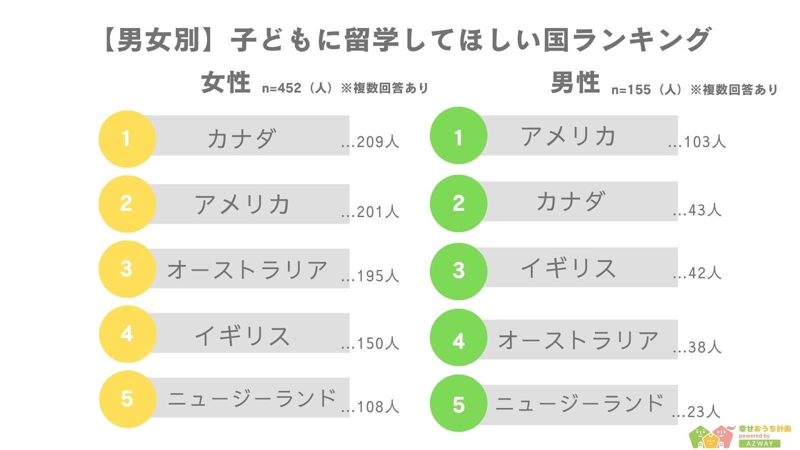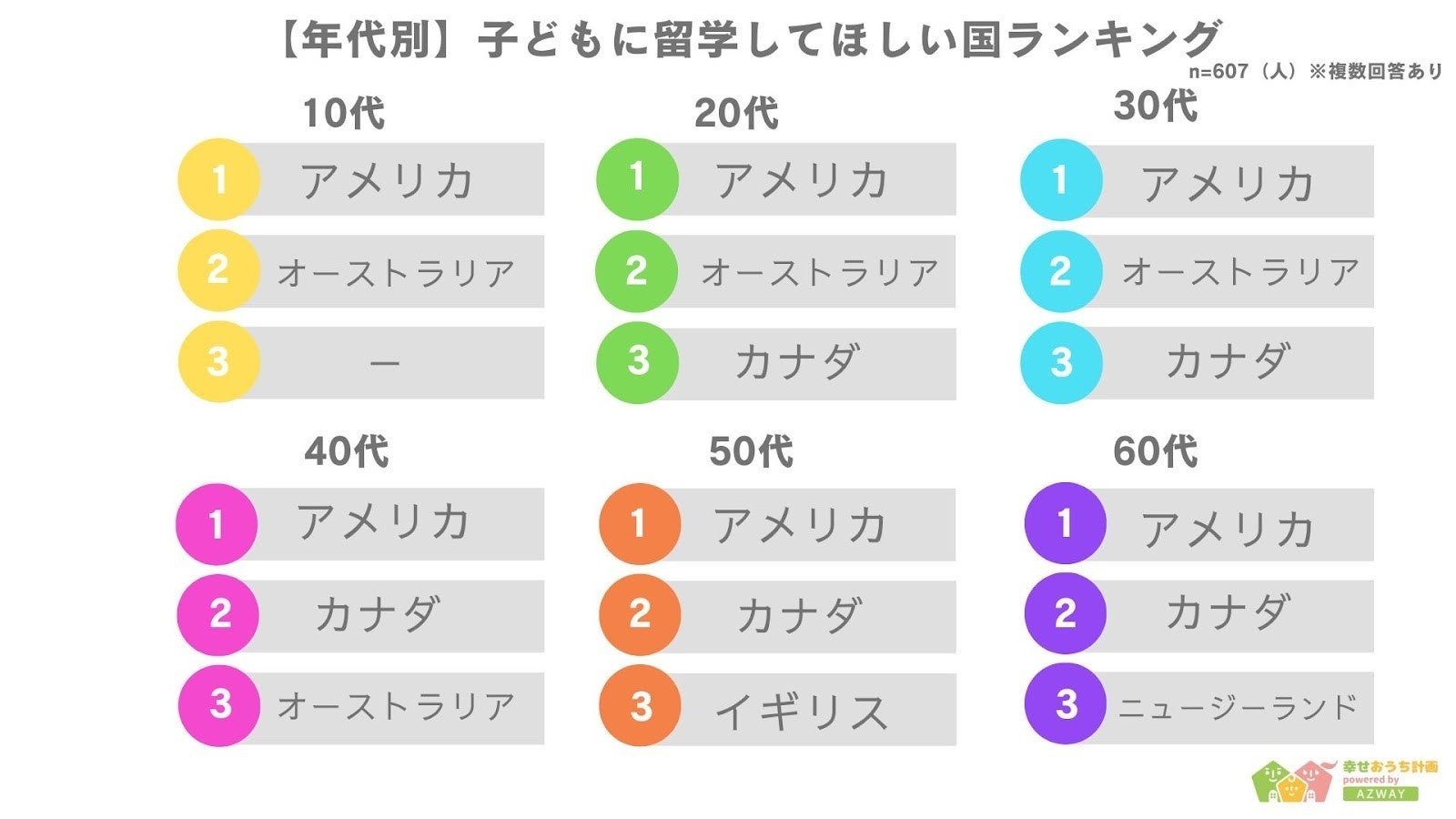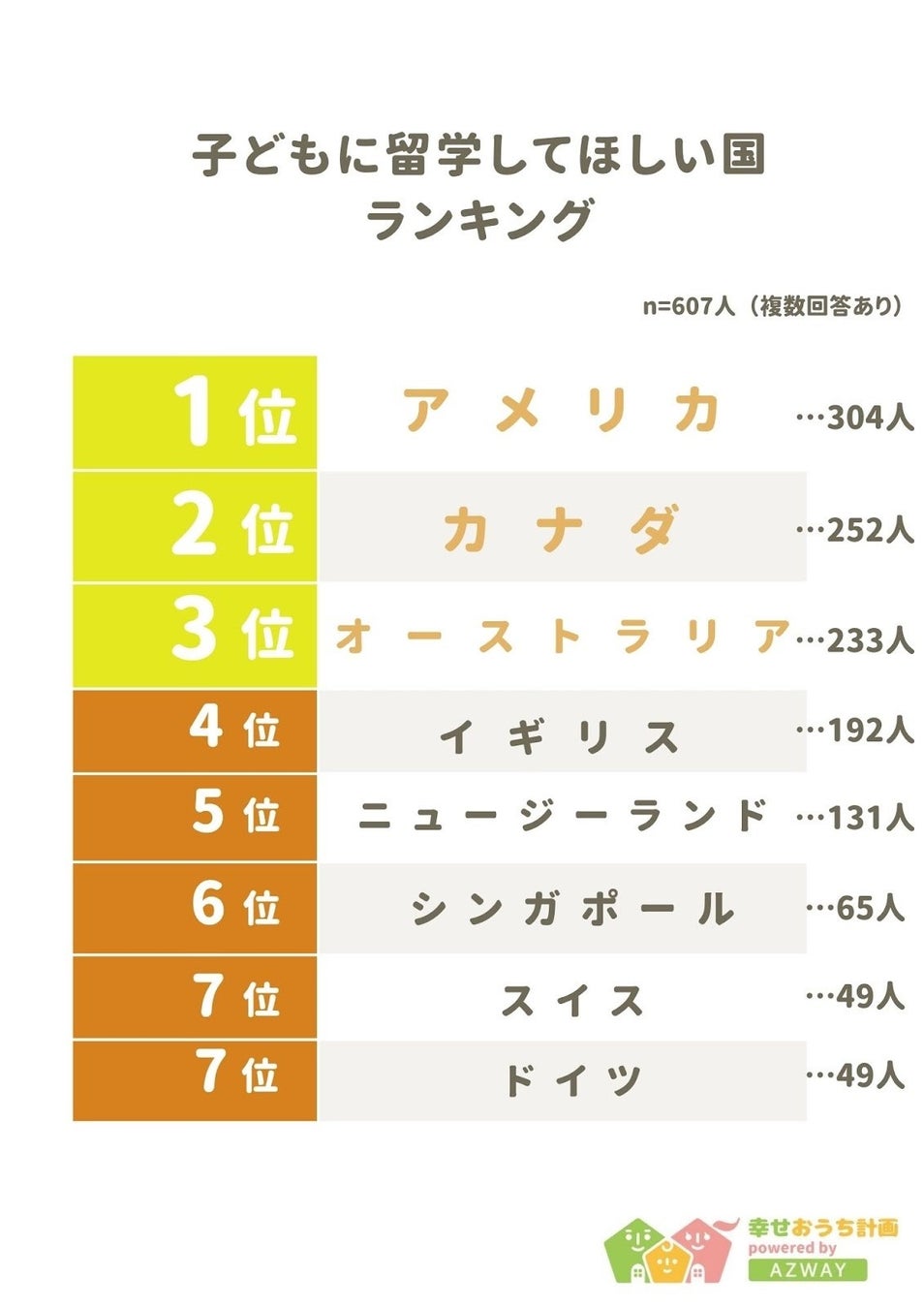 今回、株式会社AZWAY(https://azway.co.jp/)が運営する、幸せおうち計画(https://azway.co.jp/media/)は、10代から60代以上までの607人を対象に「子どもに留学してほしい国」についてアンケート調査を実施しました。
