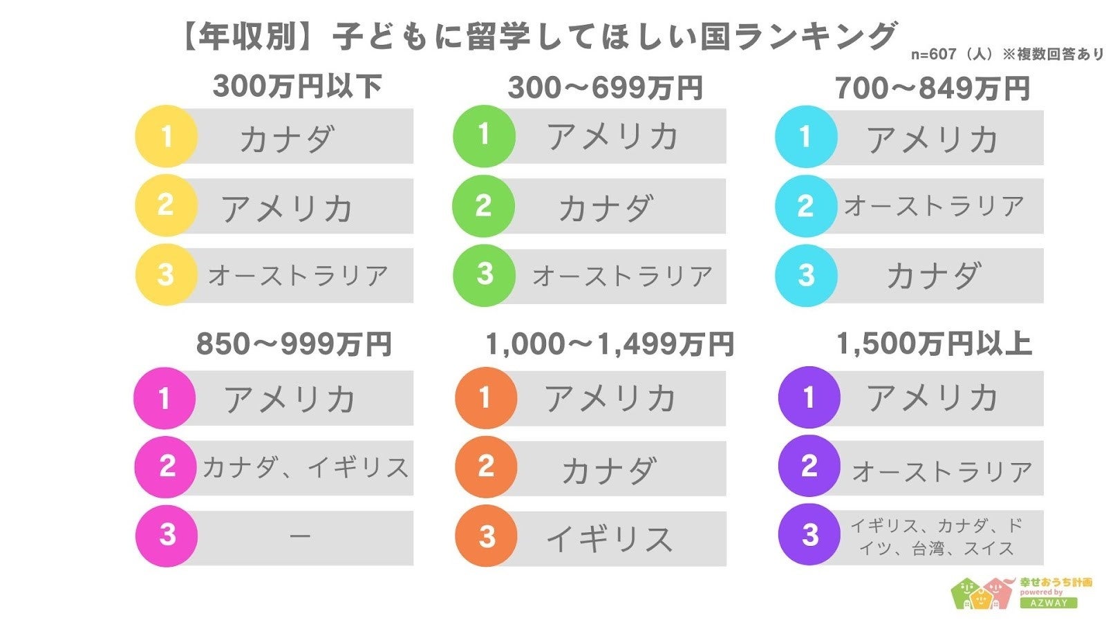 最後に、年収別に「子どもに行ってほしい国」を見たところ、300万円以下の人を除いて、1位は「アメリカ」という結果になりました。2位以降にはバラツキがありますが、カナダ、オーストラリア、イギリスが多く選ばれています。