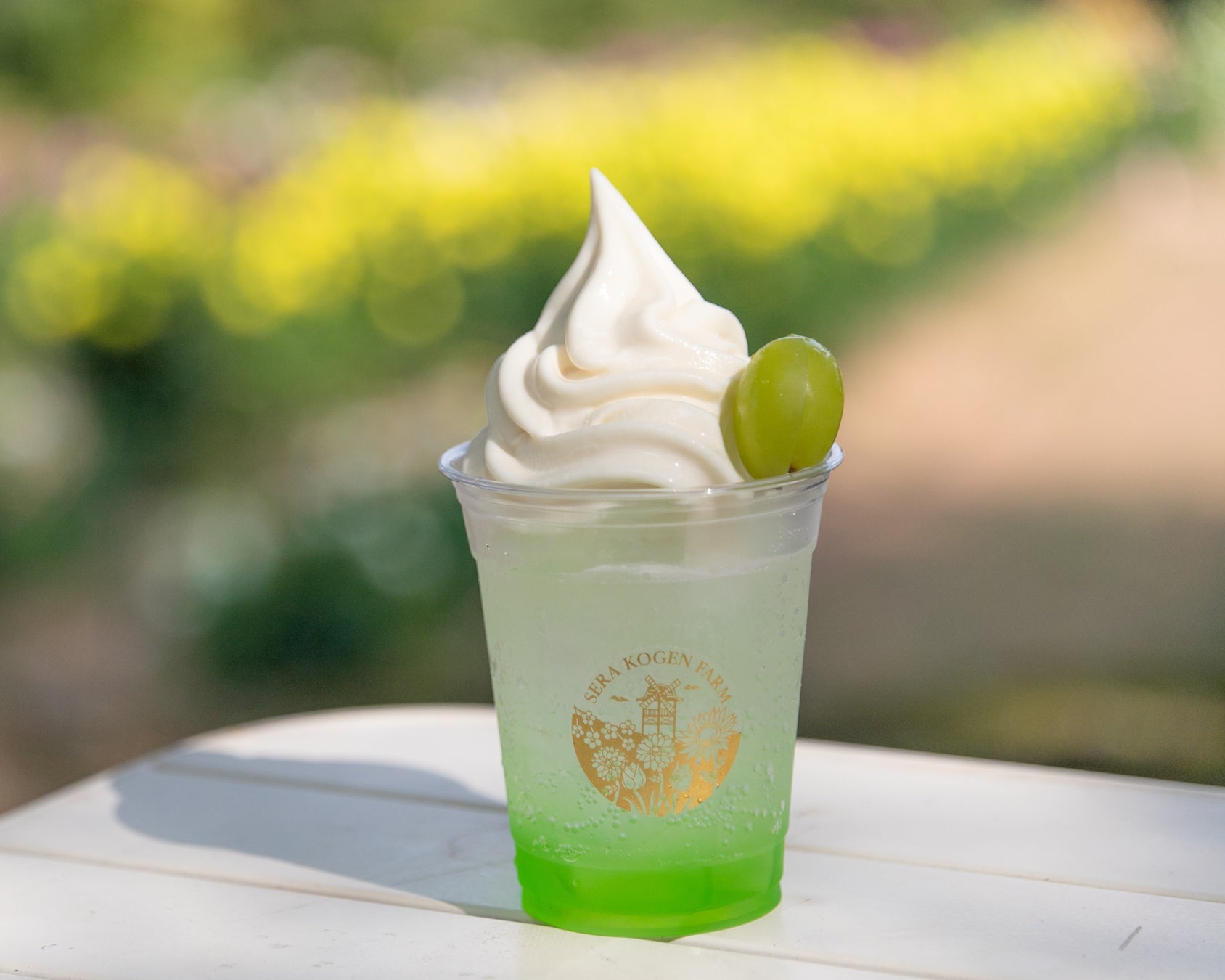 世羅産マスカットを贅沢に使用したフロート。クリーミーなソフトと絶妙にマッチ。まだ暑い園内で涼むのにもぴったりのメニューです。