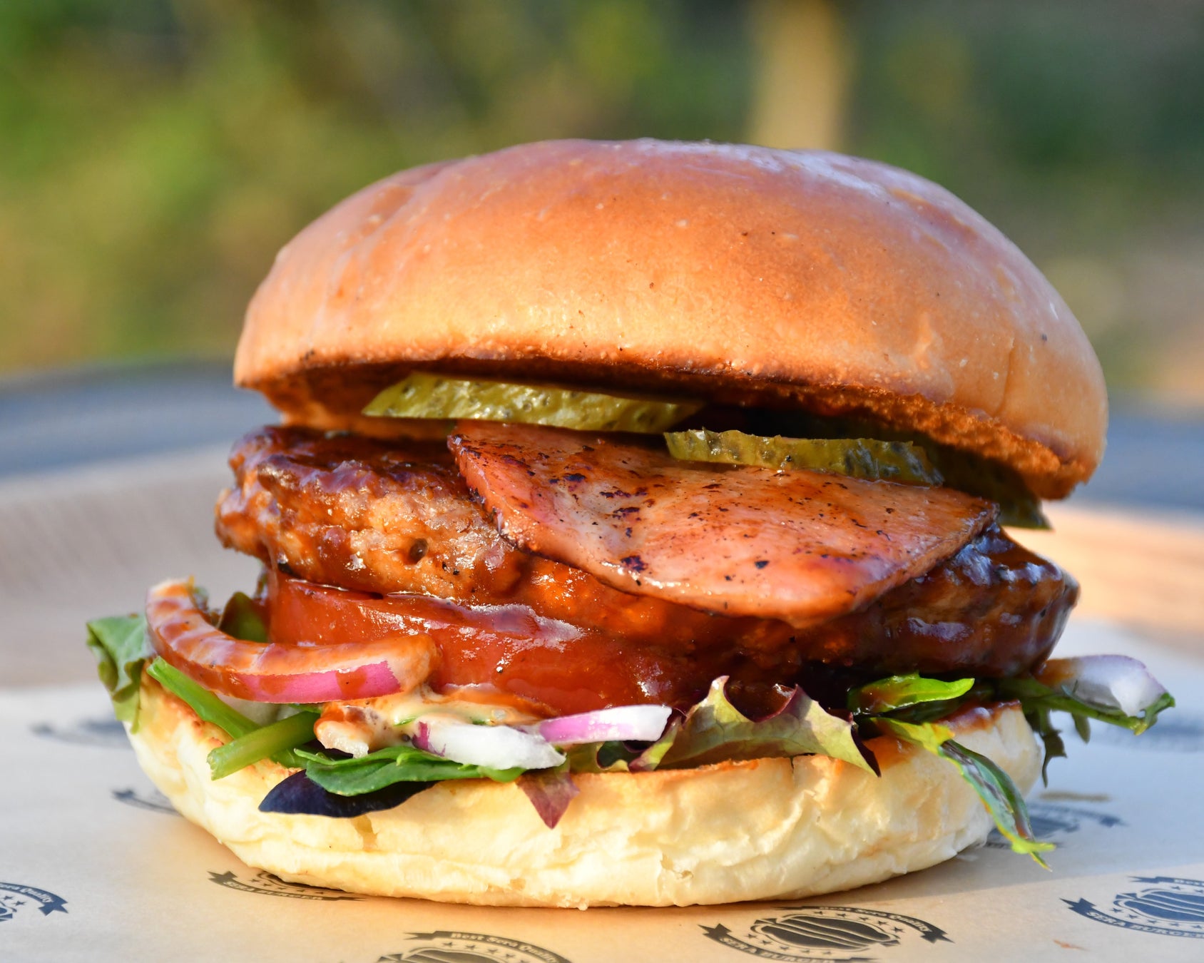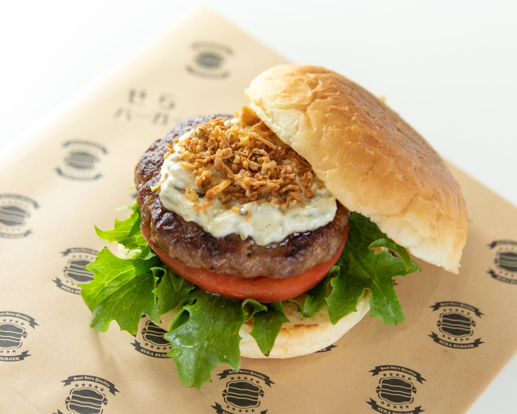 ご当地バーガーの「せらバーガー」。世羅高原農場の「農場バーガー」に、この期間は特別にプラス料金で厚切りベーコンをトッピングします。