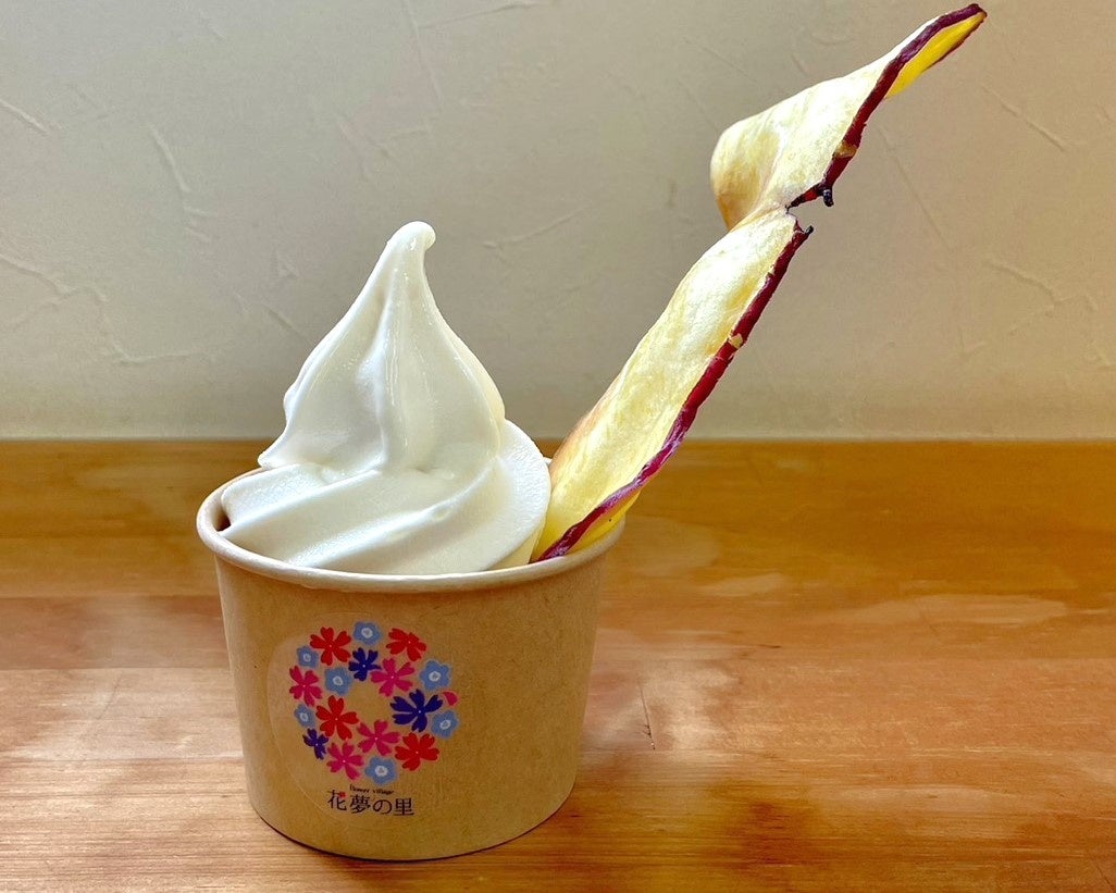 さつまいものソフトクリームにおさつチップをトッピングしています。