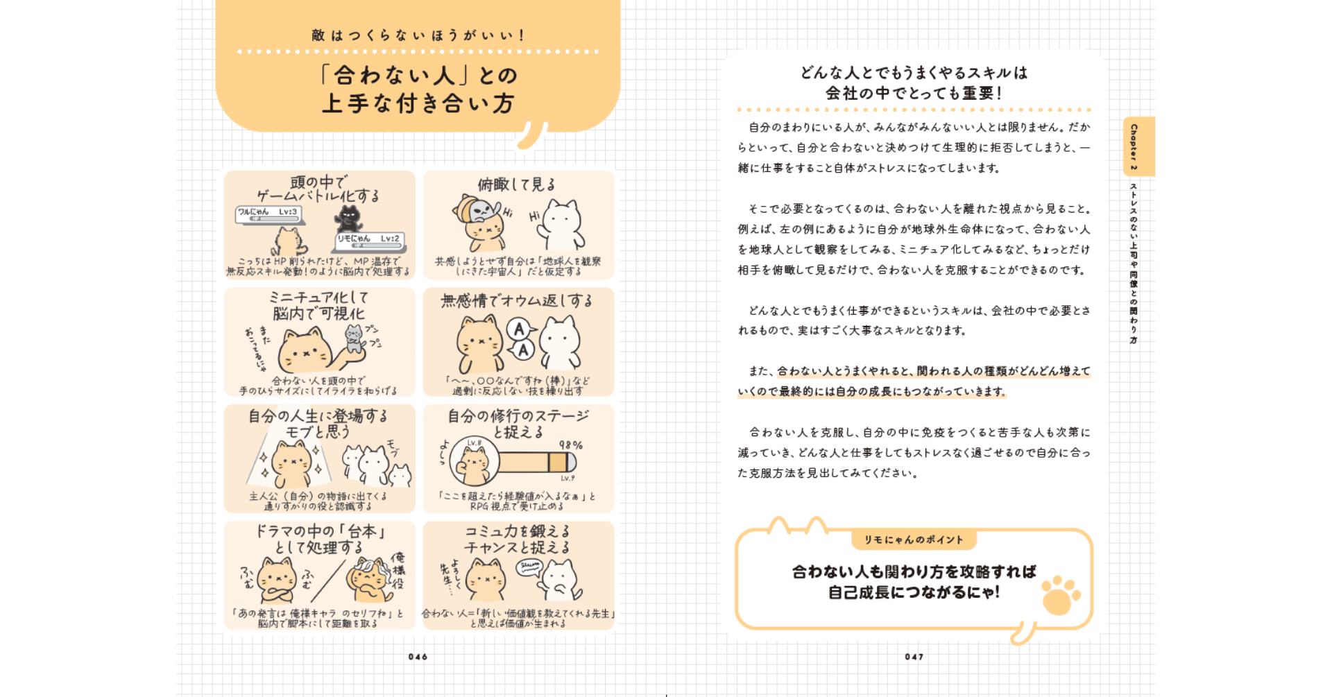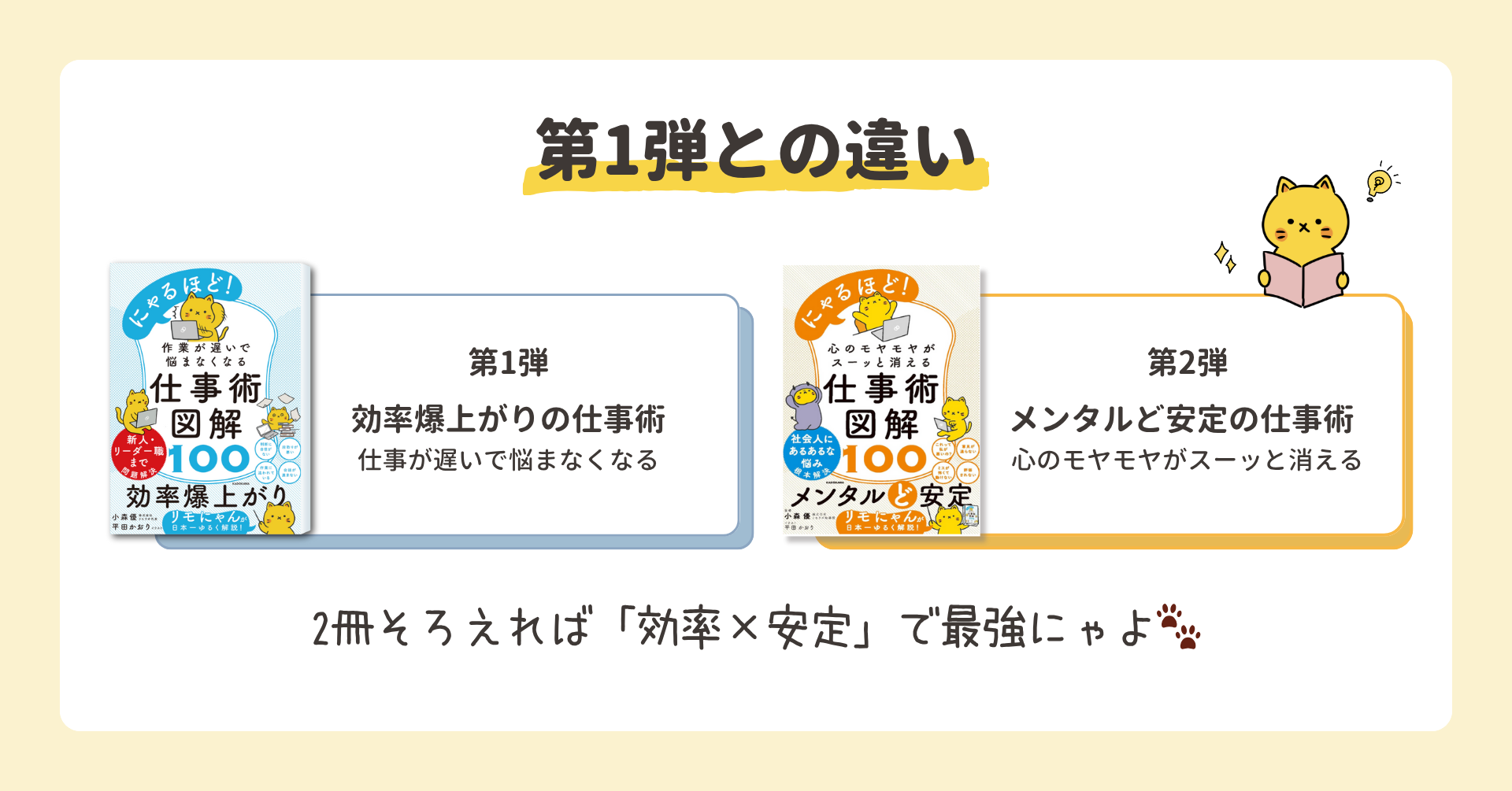 大好評の『にゃるほど!作業が遅いで悩まなくなる仕事術図解100』の第2弾として、「仕事のメンタル本も見たい!」という多くの要望の声から誕生しました。
