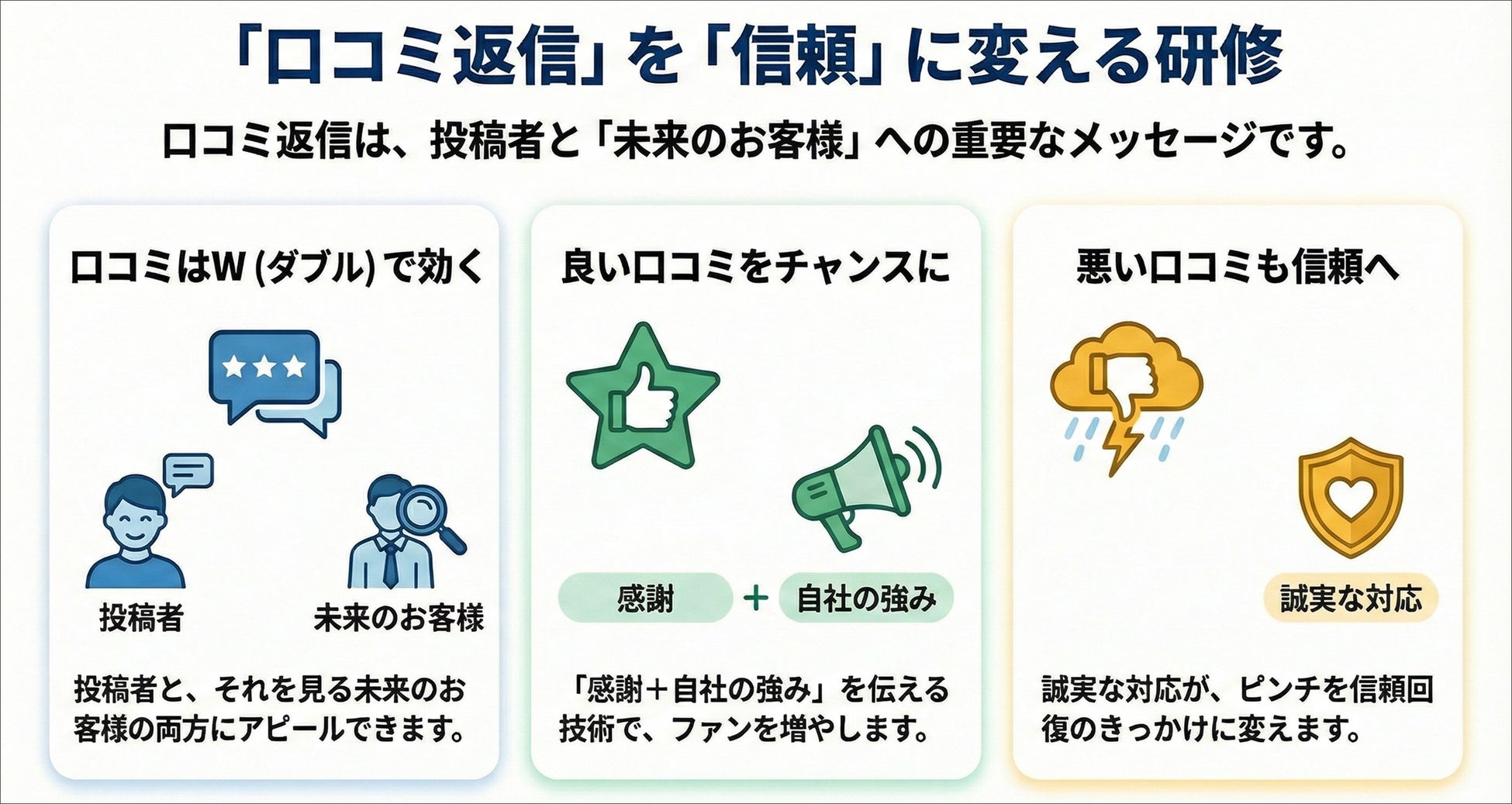 本研修では、投稿者と閲覧者の双方から信頼を得るための具体的な返信技法を習得します。