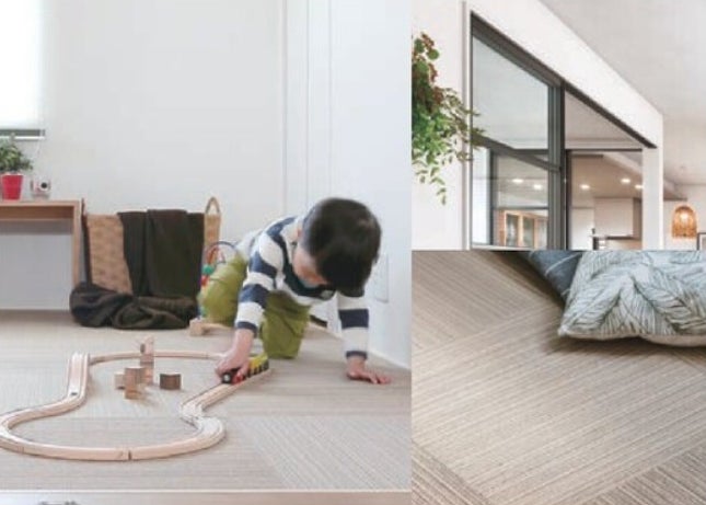 爽やかな陽光が溢れ、木の上品な温もりが漂う19帖の広さを確保したLDK。「フラットキッズ」と名付けた空間は、テキスタイル敷きの続き間とつながるようにデザインし、キッズスペースをリビングとフラットにすることで、お子様が安心して遊べる場所に仕上げました。開閉が自由なパーテーションを採用し、伸び伸びとした憩いも、一人の時間も充実します。ゆとりある19帖のLDKは、家族の団らんはもちろん、自分時間や友人・親戚とのパーティなどを楽しむこともできます。