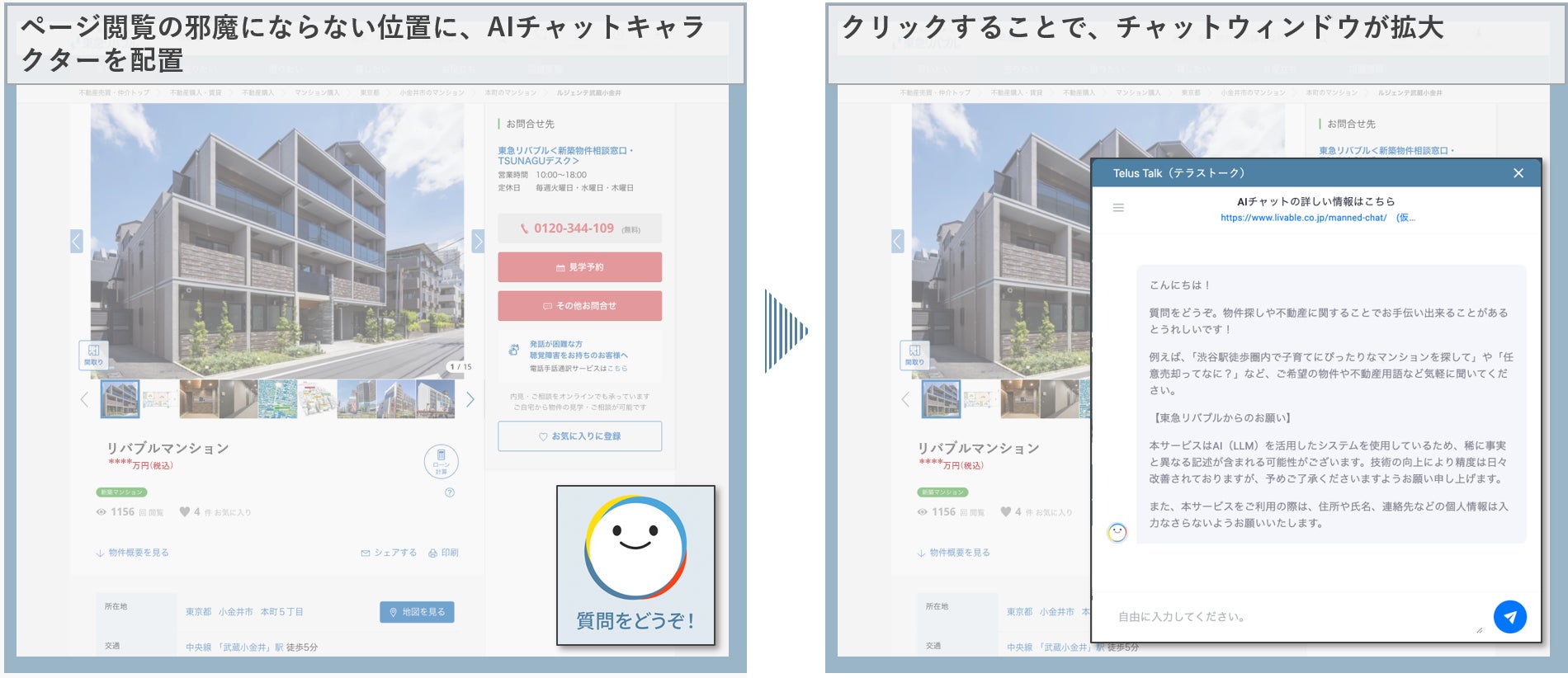 東急リバブル株式会社(本社:東京都渋谷区、代表取締役社長:太田 陽一)は、当社ホームページの購入・売却ページをご利用されるお客様のニーズに沿った情報提供(パーソナライズ)を強化し、またお客様のニーズに応じた新たなコミュニケーション手段を提供することを目的として、生成AIに関する専門知見を有する株式会社電通デジタルおよび株式会社電通と共同で、生成AIを活用した対話型チャットサービス「Tellus Talk(テラストーク):β版」を開発しました。このサービスは2025年3月27日(木)午前11時から当社ホームページ上で提供を開始いたします。