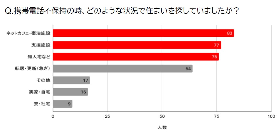住居を借りようとした人のうち、48.3%が「連絡先がないため契約が進まなかった/諦めた」と回答。家を借りるには電話番号が必要で、電話番号を取得するには生活基盤が必要——この“解決不能なパラドックス”が、住居喪失者をネットカフェ生活へと押し戻しています。