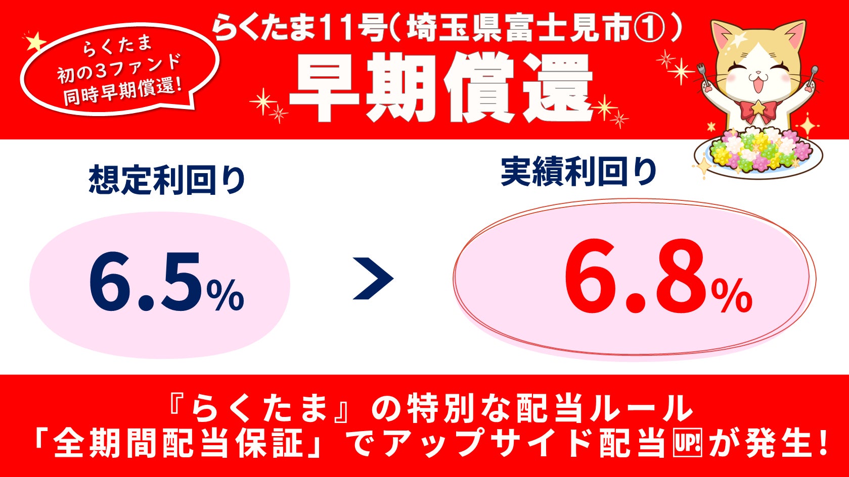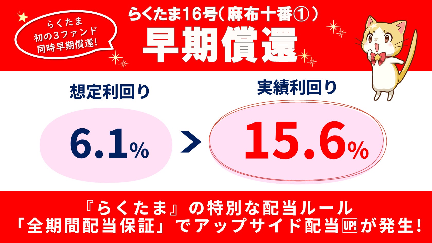 【速報!らくたま11号・15号・16号は早期償還】『らくたま』の特別配当ルール「全期間配当保証」適用によるアップサイド配当で、実績利回りは11号は6.8%、15号は9.8%、16号は15.6%を記録!
